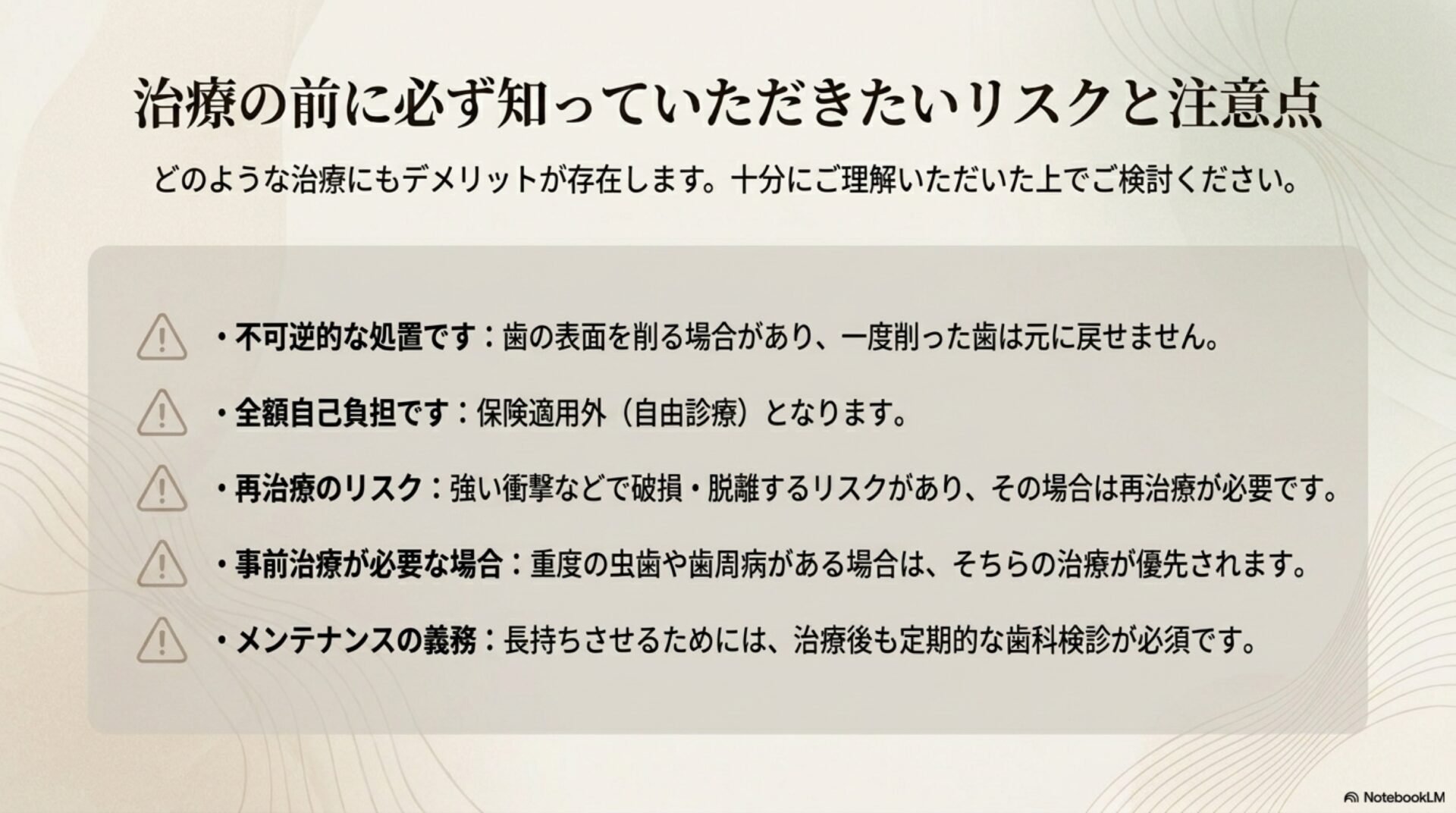 当院では、薄さと強度を両立したジルコニアシェル「ジルコブライト®」を用い、歯を削らない(ノンプレップ)選択肢を追求しています。ただし、お口の状態により削る処置が必要な場合は、元に戻せない「不可逆的(ふかぎゃくてき)」な治療となります。だからこそ、事前の診断とカウンセリングを何より大切にしています。