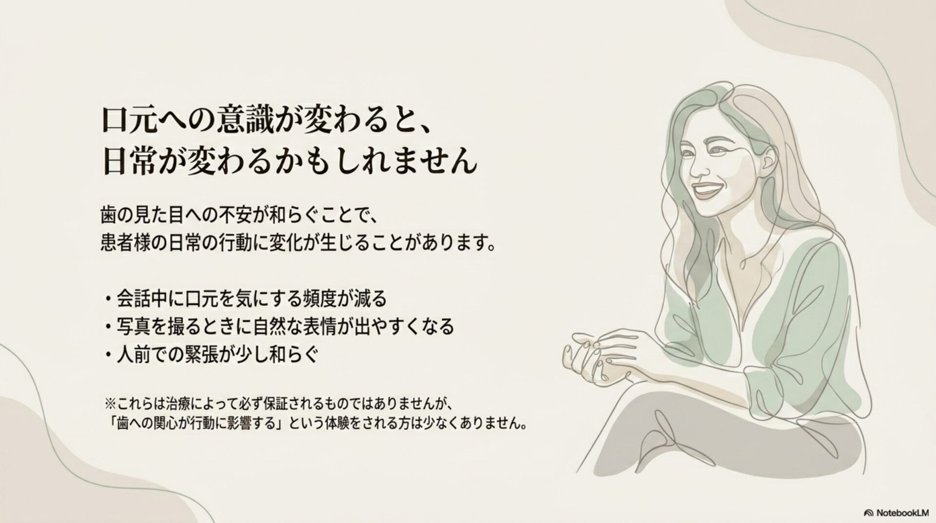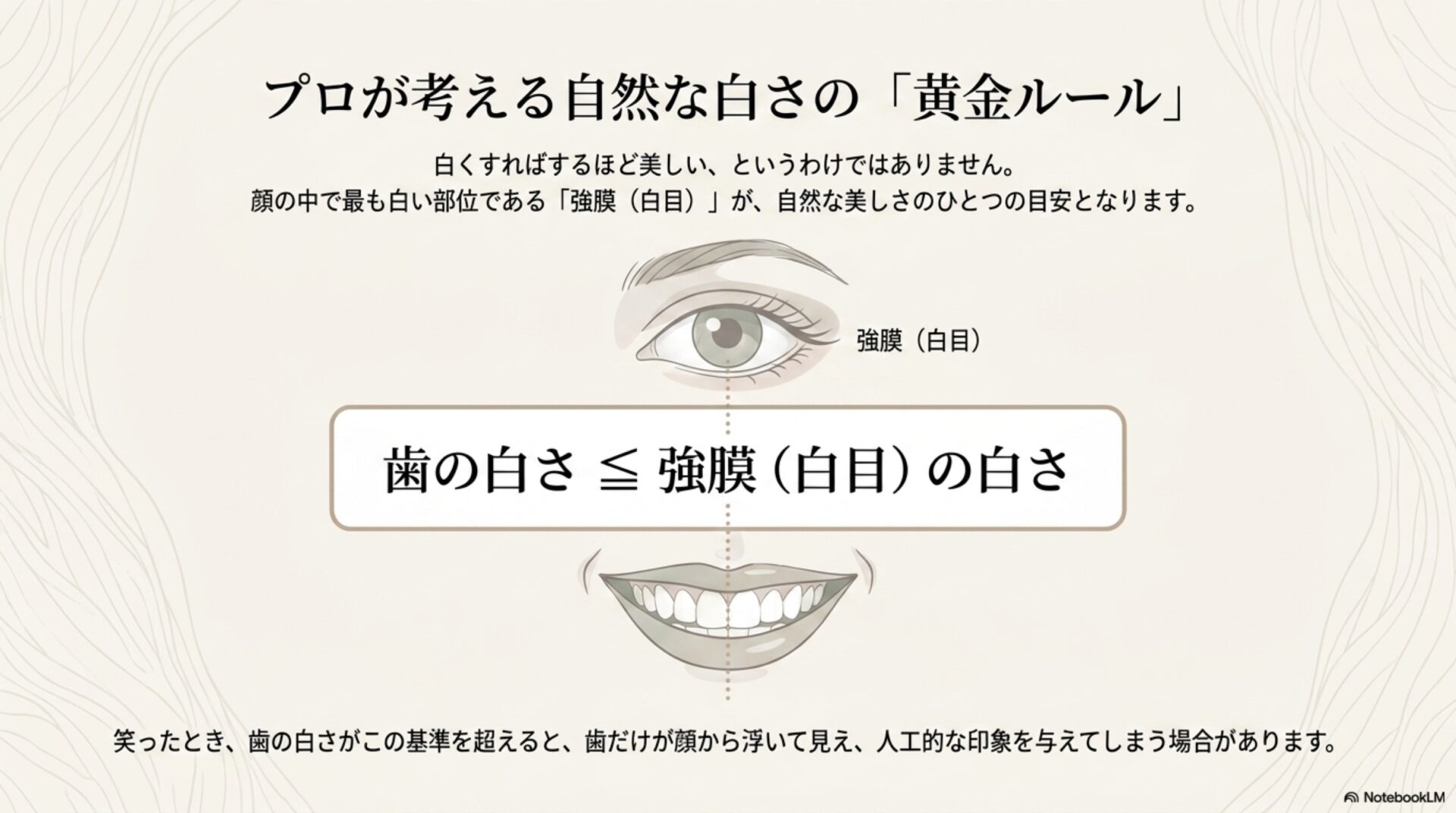 歯科医師として「歯を白くしたいが、健康な歯を削るのは怖い」という葛藤に深く共感します。理想を叶えたい願いと、自分の歯を大切に守りたい想いの間で悩むのは、ご自身の体を慈しむからこその、非常に尊い感覚です。