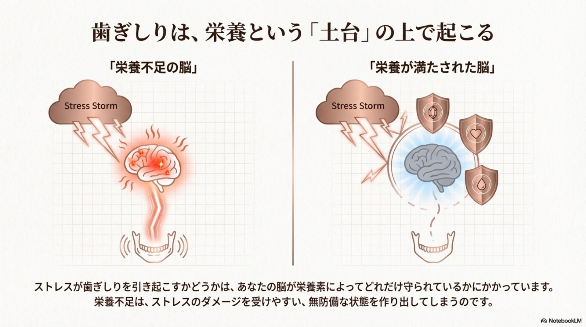 しかし、近年の研究では、ストレスと歯ぎしりの間には、もっと深く、意外な関係があることがわかってきました。それは、特定の「栄養素の不足」が、歯ぎしりを引き起こし、悪化させる可能性があるということです。ストレスによって体内の重要な栄養素が消費され、その栄養素が不足することで、さらに体がストレスに弱くなる…この記事では、この「悪循環」の正体と、それに関わる3つの重要な栄養素について、わかりやすく解説していきます。