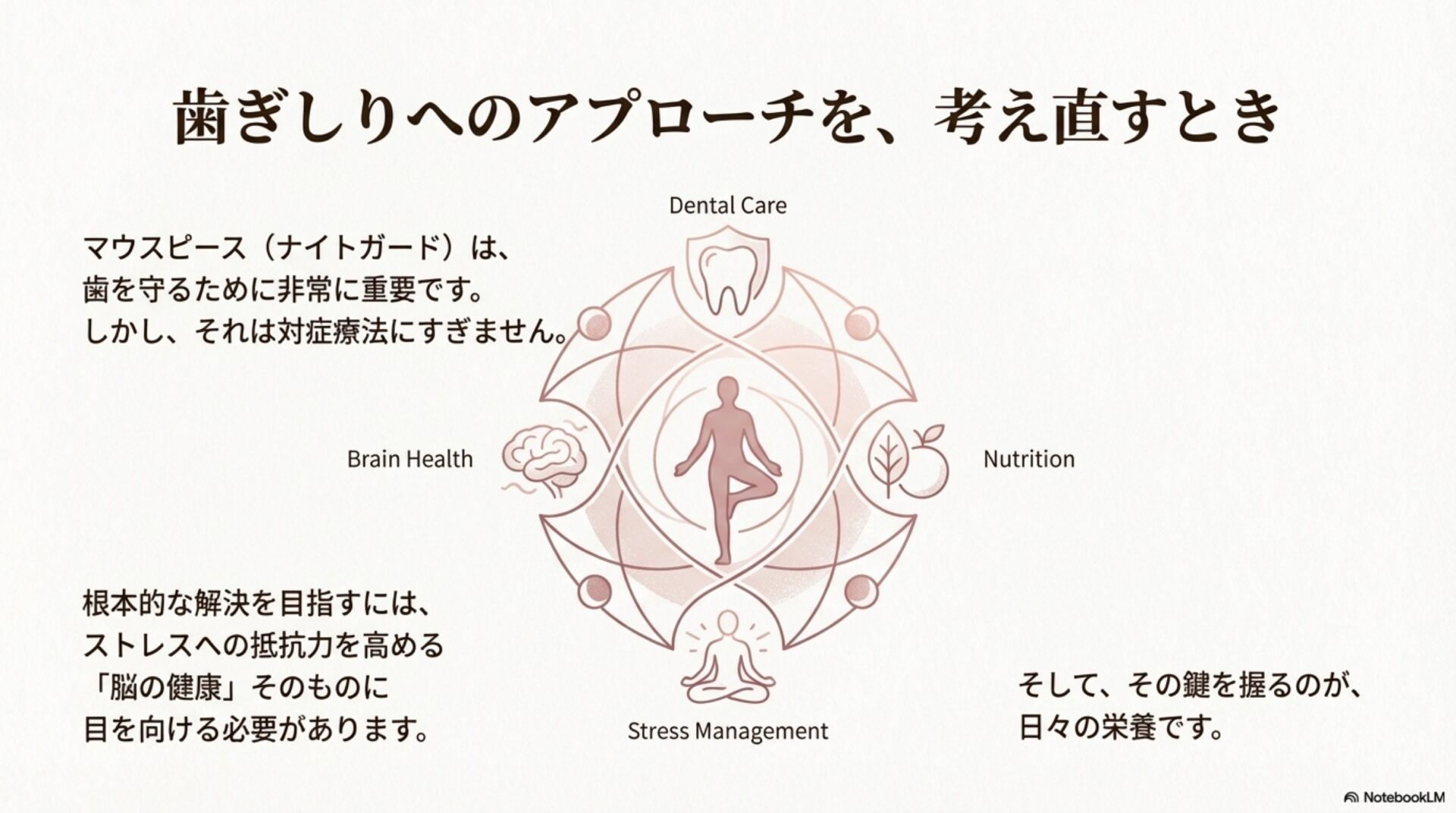 歯ぎしりは、単なる口元の癖ではなく、ストレスと栄養状態の両方に関わる、あなたの体からの「実行可能な情報(Actionable Intelligence)」です。この記事で得た知識は、ご自身の体を包括的に理解し、より生産的な対話を医師と行うための強力なツールとなります。