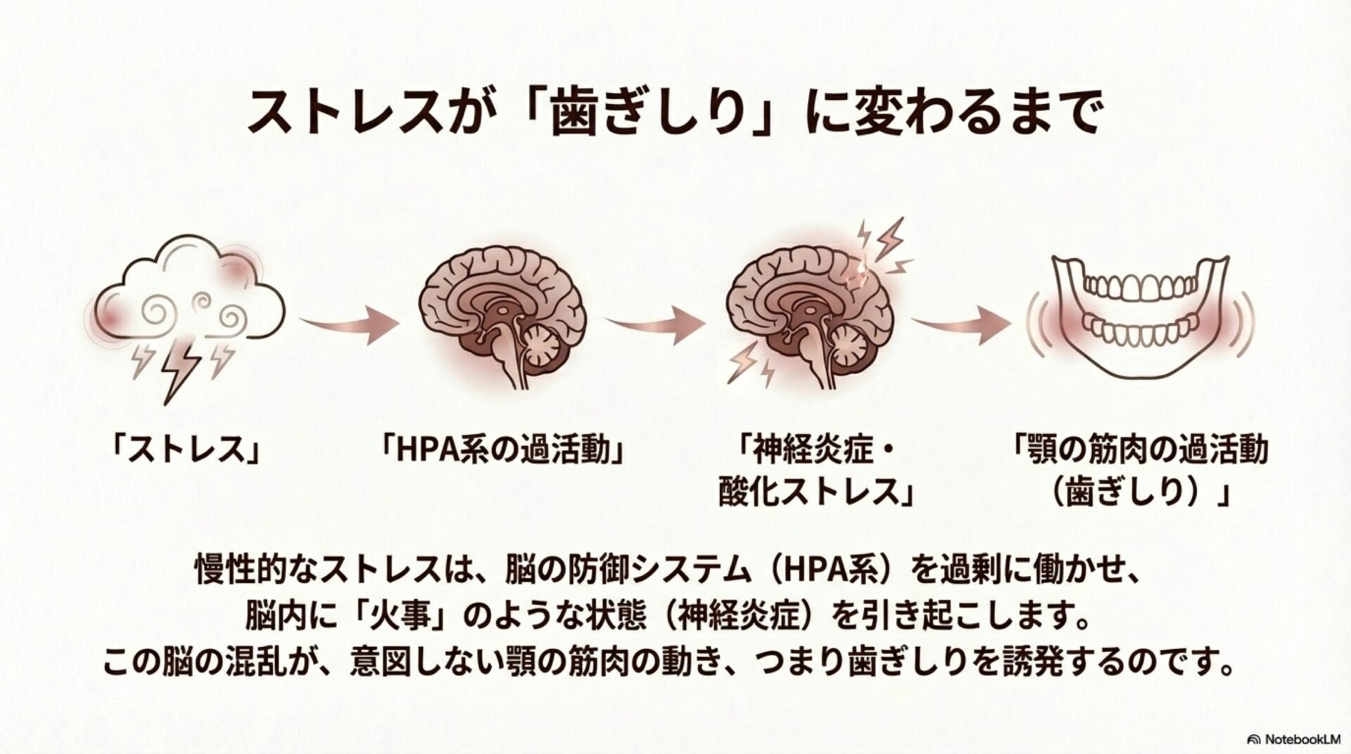 ここで重要なのが、ストレスと栄養不足が「悪循環」を生み出すという点です。これを理解することが、歯ぎしり対策の鍵となります。