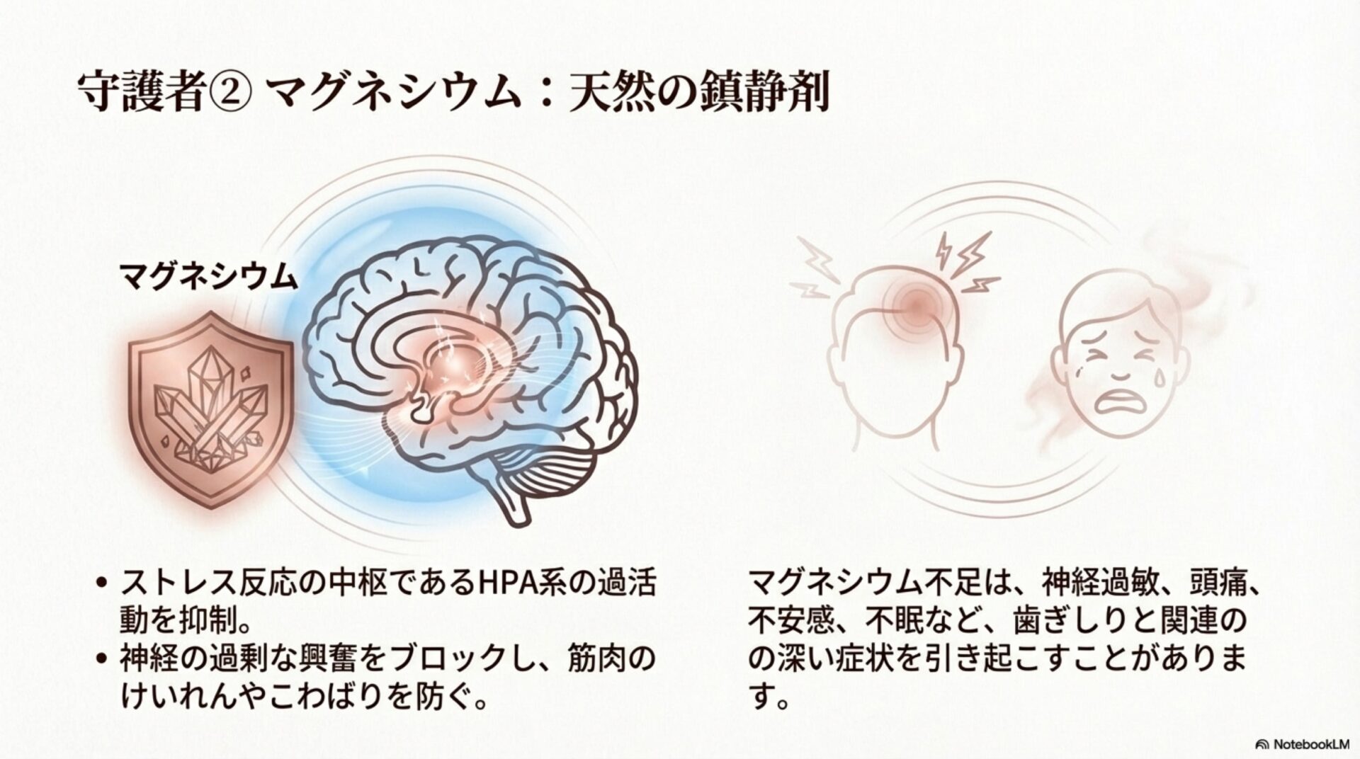 マグネシウムが不足すると、神経は過敏になり、ストレスに対する体の抵抗力が弱まってしまいます。それはまるで、体のアクセルが常にオンになったままで、心と筋肉の緊張が解けにくい状態に似ています。