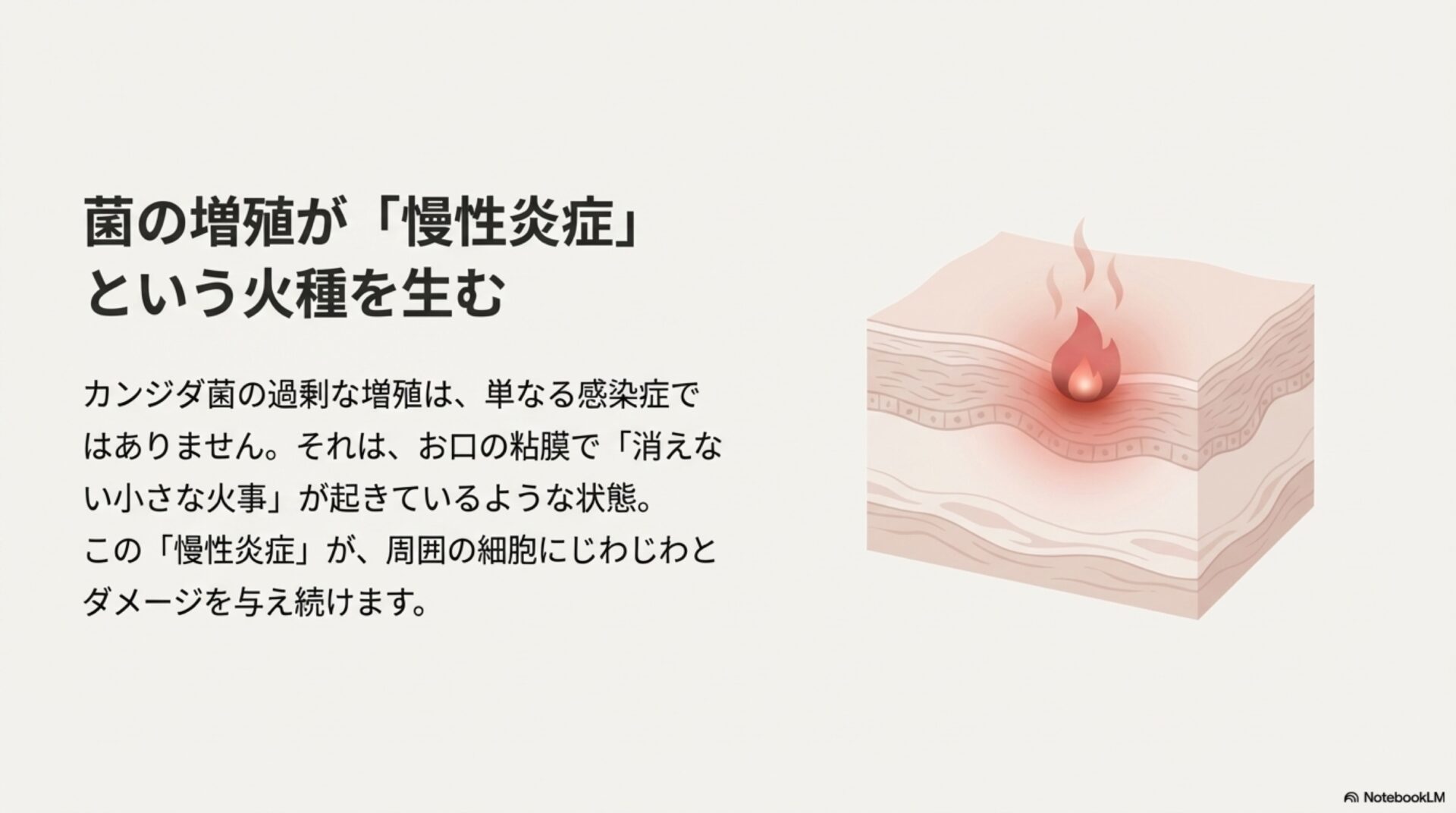 カンジダ菌ががんと関連する最大の理由は、「慢性炎症」を引き起こすことにあります。これは、短期間で治る痛みや腫れとは異なり、長期間にわたって持続する、低レベルの刺激が口の中で続く状態を指します。この状態が、がん細胞が育ちやすい危険な環境を作り出してしまいます。