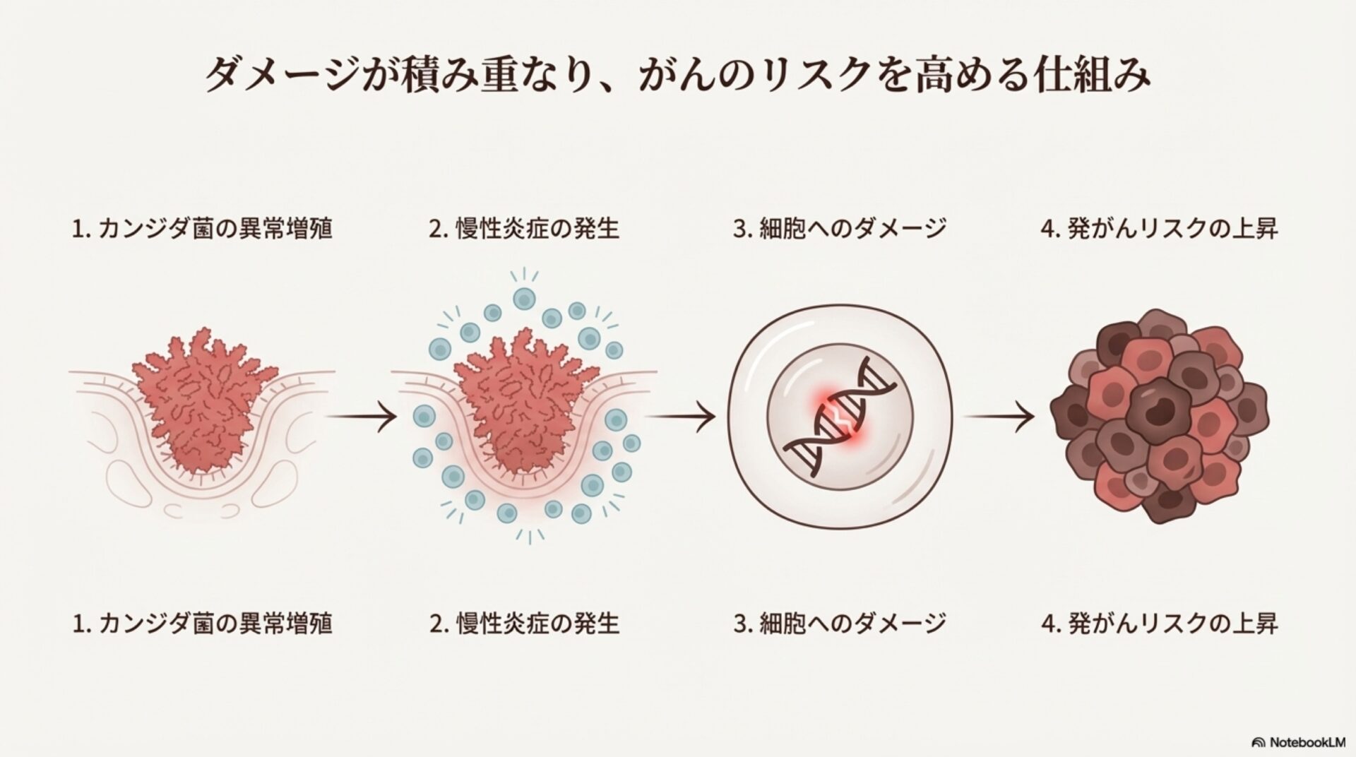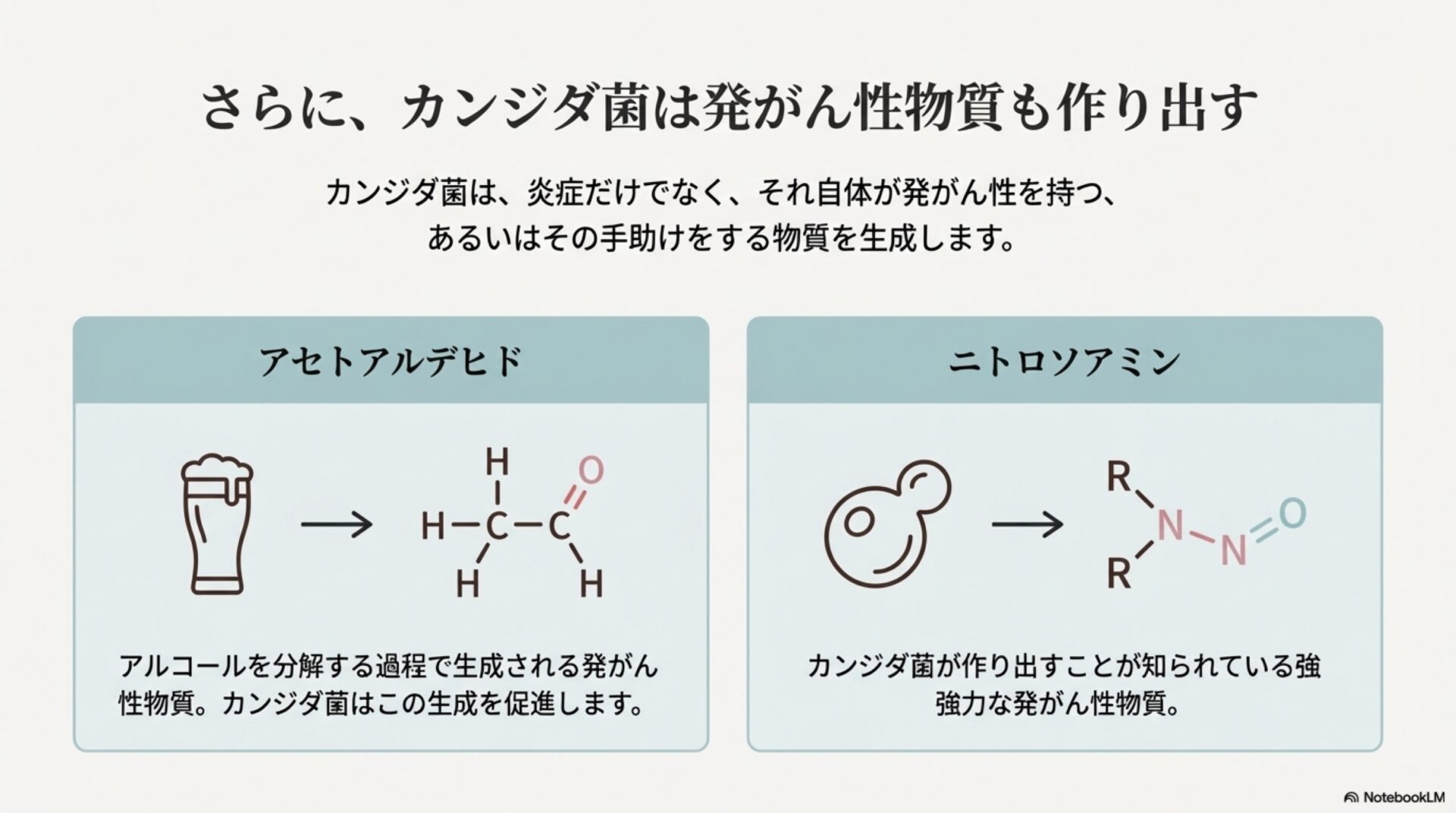 - 発がん性代謝物の産生:さらに、この炎症環境の中でカンジダ菌は、アセトアルデヒドやニトロソアミンといった発がん性を持つ代謝物を自ら産生することが知られています。