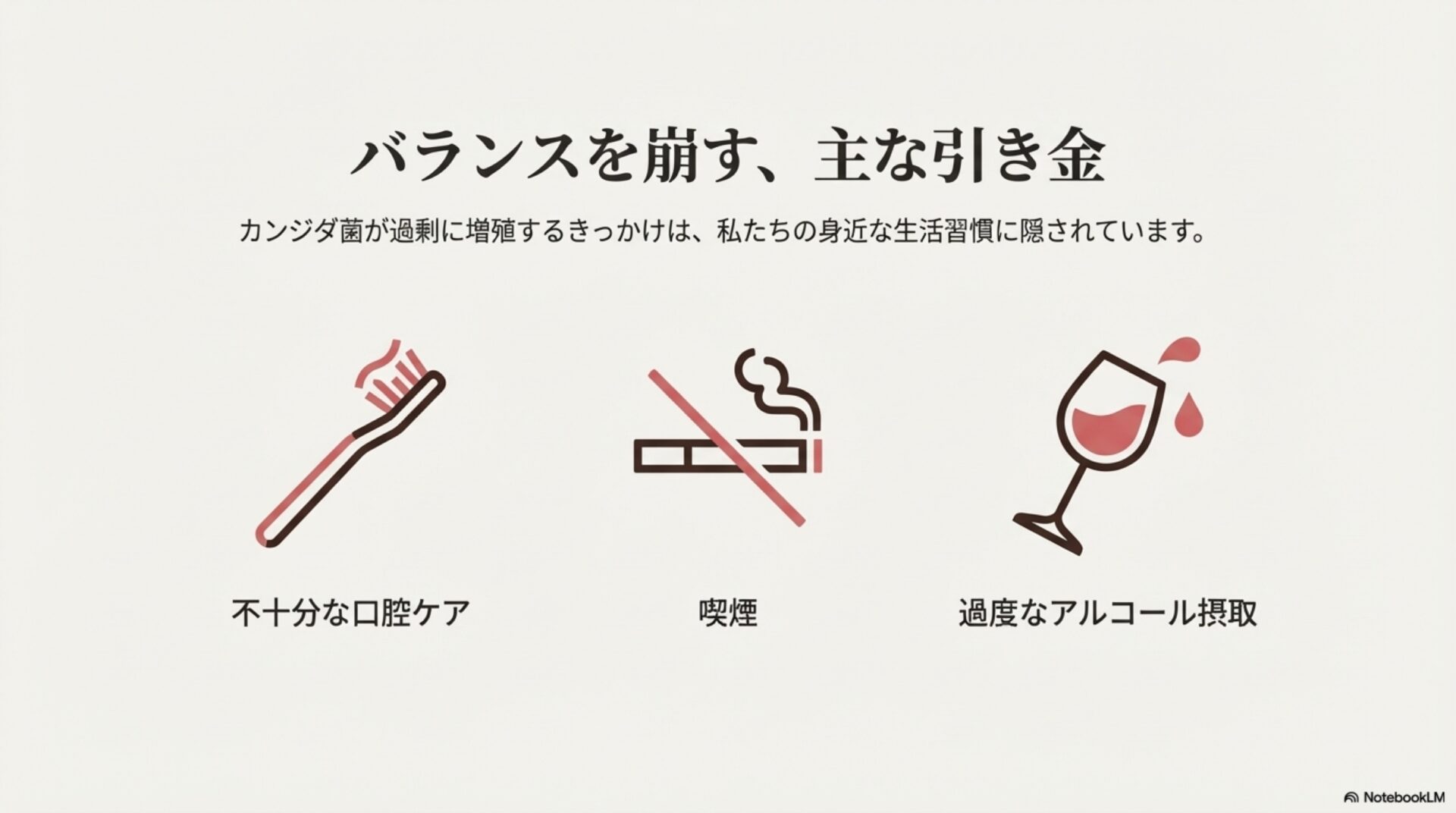 要するに、カンジダ菌が口の中に居座り続けることで、がん細胞の発生と成長を助ける「発がん促進的な微小環境」が作られてしまうのです。これは、がんの「種」が芽吹き、育つための「肥沃な土壌」を口の中に作ってしまうようなものです。しかし、この環境は偶然に生まれるわけではありません。私たちの生活習慣が、その引き金となるのです。
