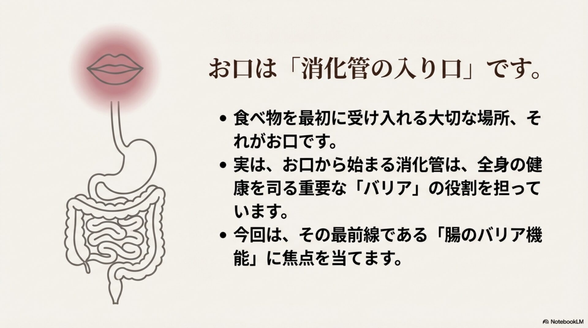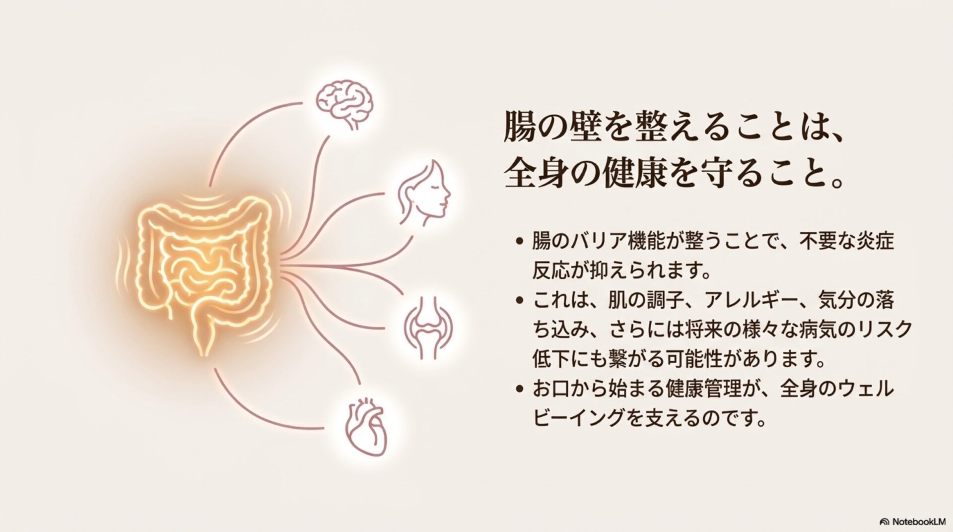 「なぜ歯医者さんが腸の話を?」と不思議に思われるかもしれません。しかし、私たちの体はすべてつながった一つのシステムです。