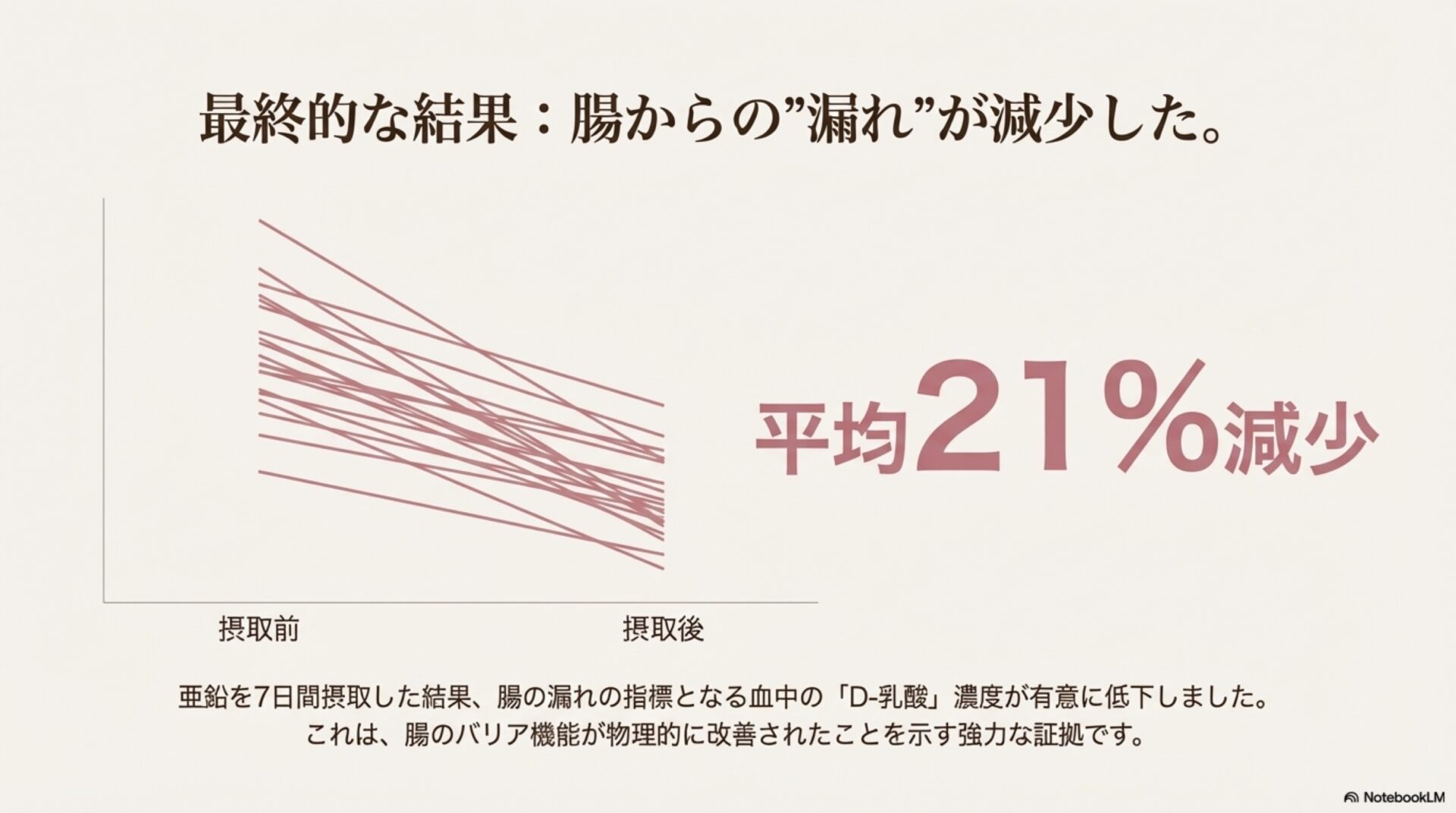 結果は驚くべきものでした。もともとD-乳酸の値が高かった(=腸が漏れやすかった)参加者において、亜鉛を摂取した後、D-乳酸の血中濃度が平均で21%も減少したのです。これは、亜鉛が特に腸のバリア機能が低下している人に対して、より顕著な効果を発揮する可能性を示唆しています。
