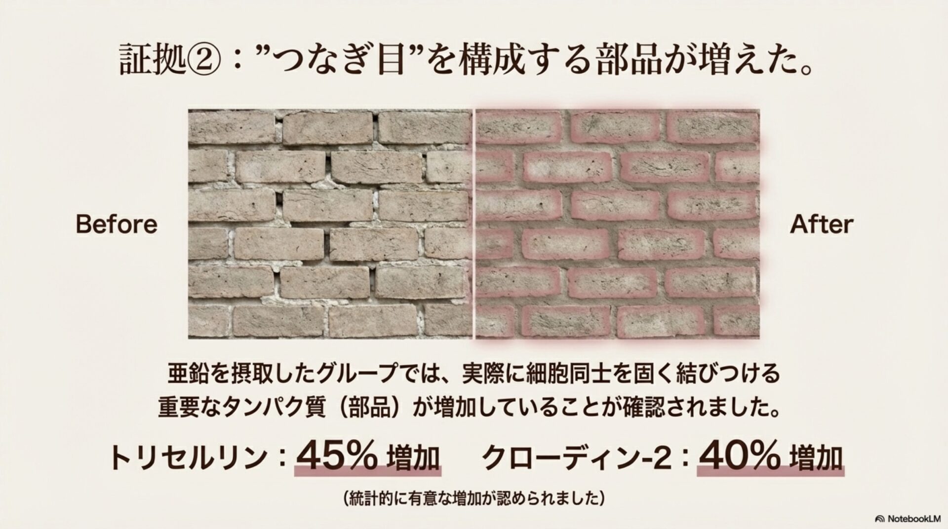 この研究では、参加者から採取した腸の組織を分析しました。その結果、亜鉛を摂取したグループでは、この「モルタル」を構成する重要なタンパク質が劇的に増加していることが判明しました。具体的には、「モルタル」の主成分である「クローディン-2」が平均40%、「トリセルリン」が平均45%も増加しており、統計的にも有意な差が認められたのです。