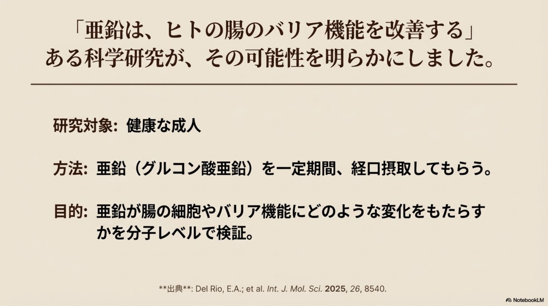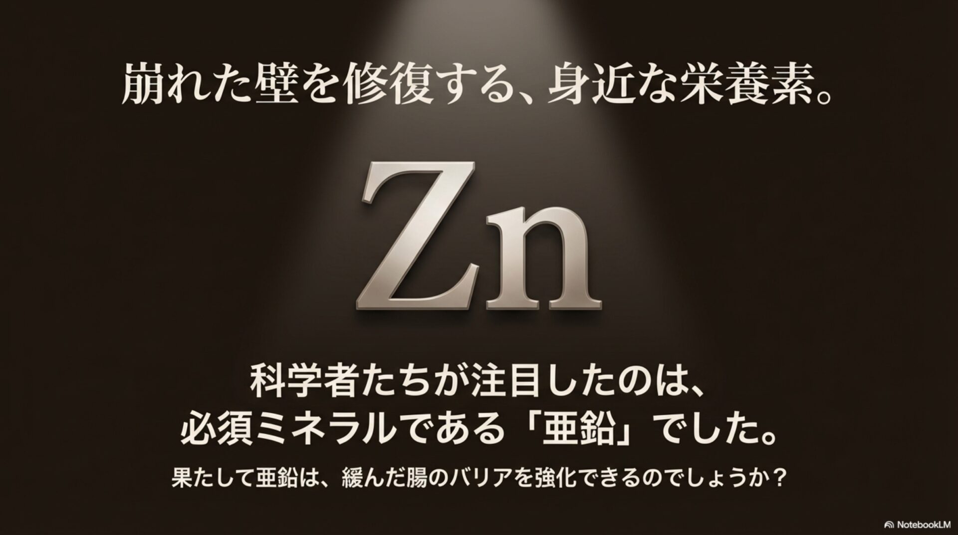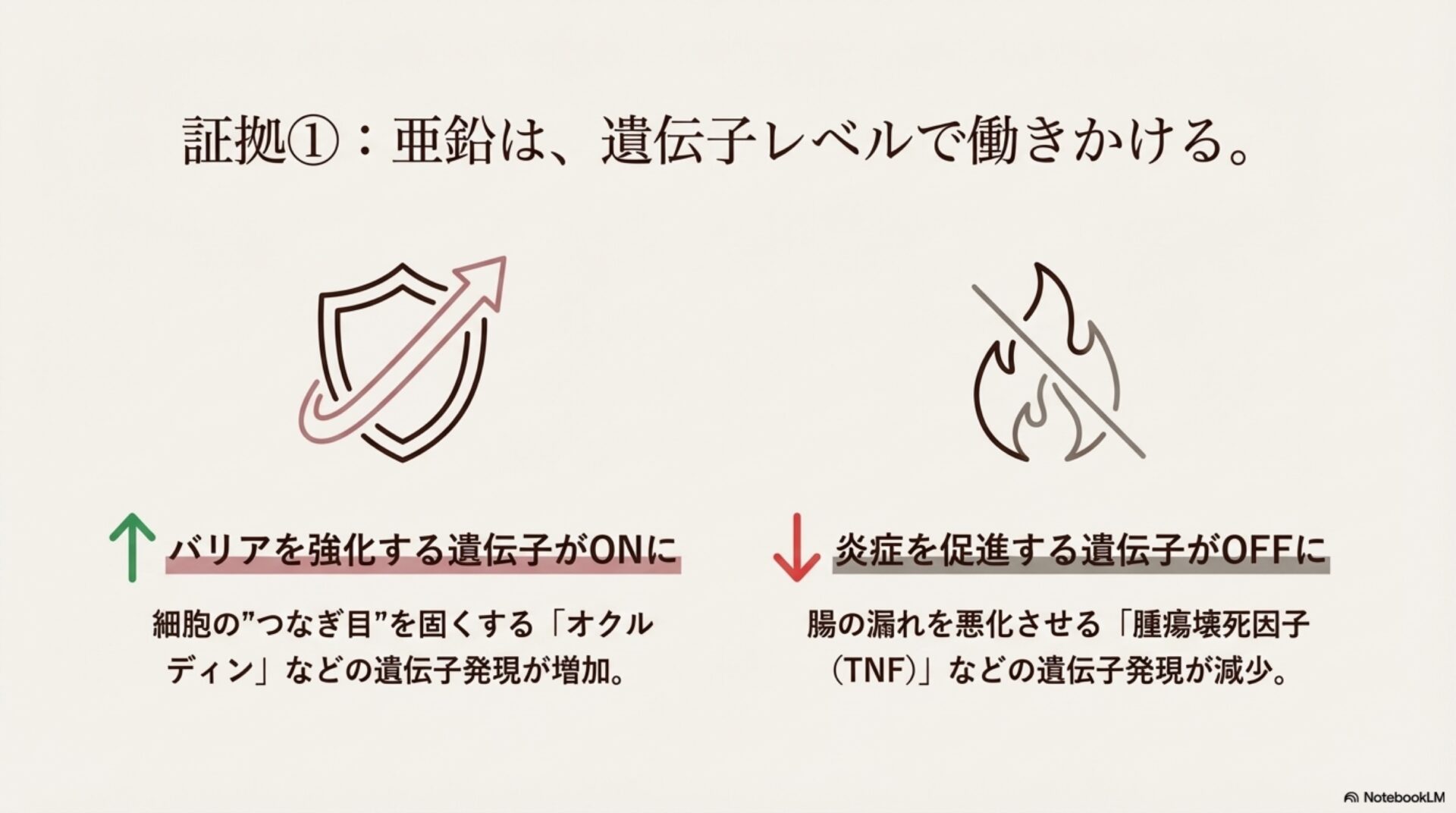 まとめると、亜鉛は私たちの体の設計図である遺伝子レベルで働きかけ、「バリアを強化し、炎症を抑制する」という二重の指令を出すことで、腸を内側から健康な状態へと導いてくれるのです。