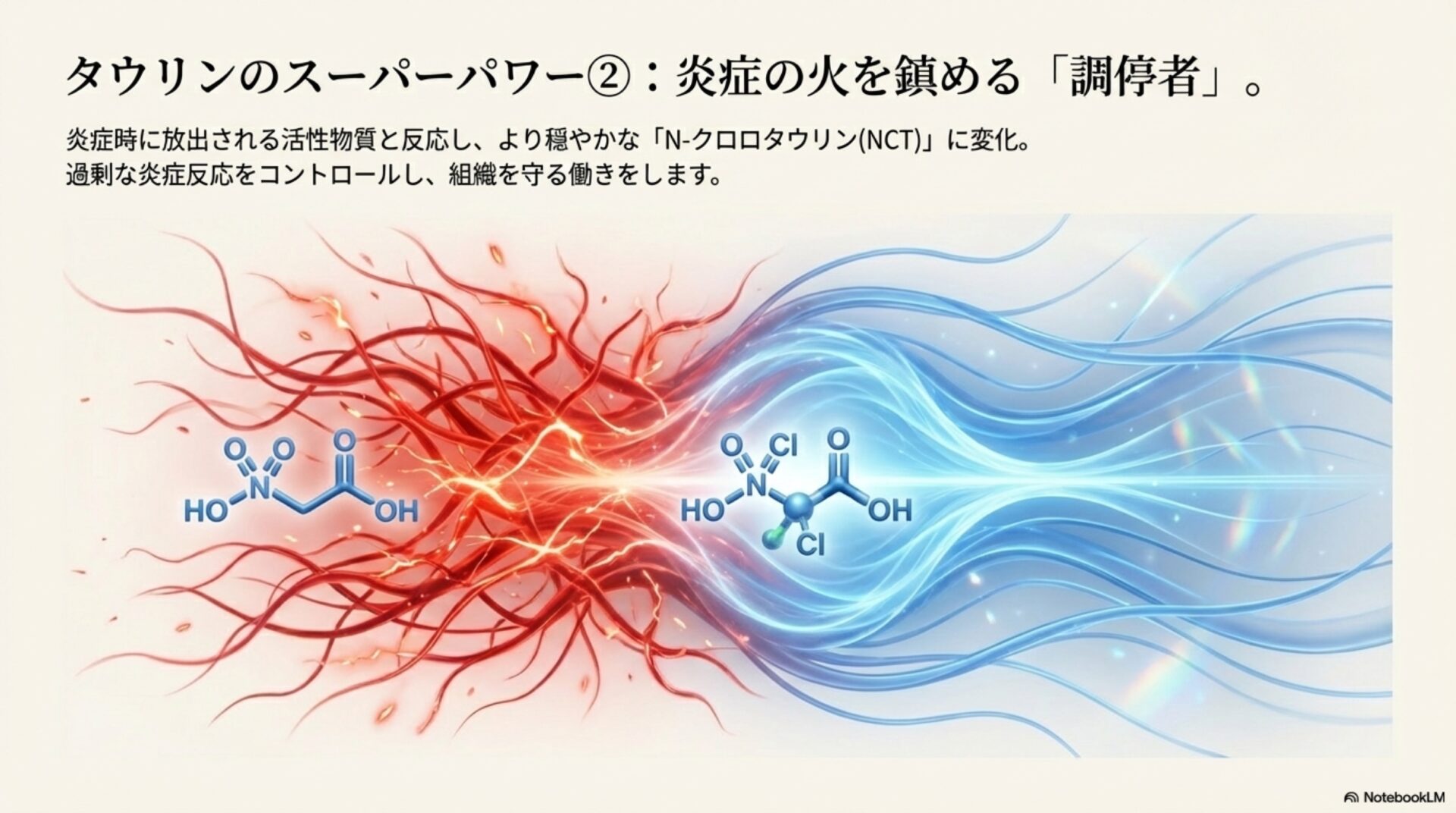 - NCTの作用: 一方で、タウリンが変化してできる「N-クロロタウリン(NCT)」は、正常な細胞よりもがん細胞に対してアポトーシス(プログラムされた細胞死)を引き起こしやすいという報告があります。