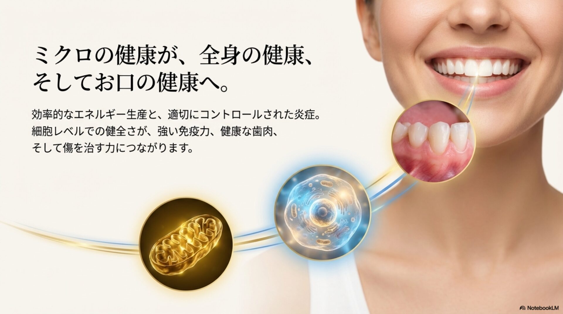 このように、タウリンは私たちの細胞レベルの健康を維持するための「多機能な調整役」なのです。口腔内の健康が全身の健康のバロメーターであるように、タウリンの働きは、私たちの体の最小単位である細胞の健康が、いかに全体の生命活動に繋がっているかを教えてくれます。