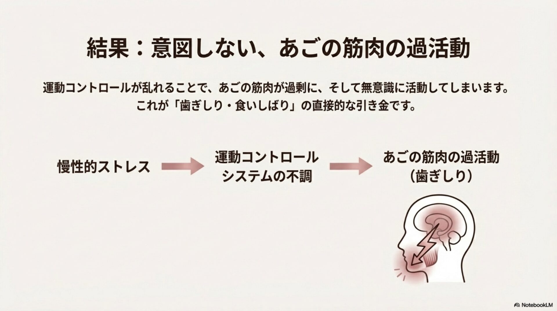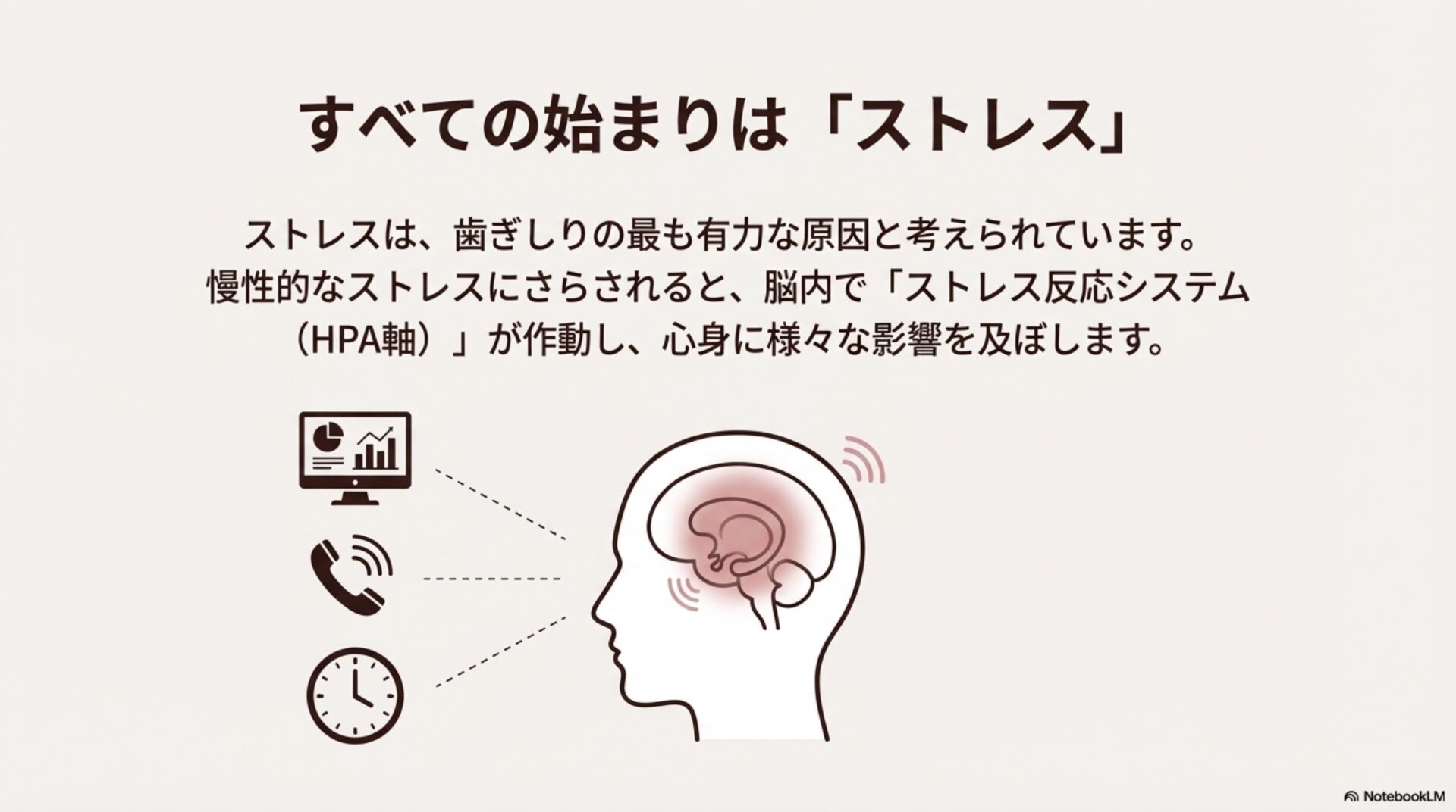 ストレスが歯ぎしりの原因になる、というのは想像しやすいかもしれません。しかし、衝撃的なのはその逆もまた真実であるということです。歯ぎしりはストレスの結果であると同時に、新たなストレスの原因にもなり得ます。
