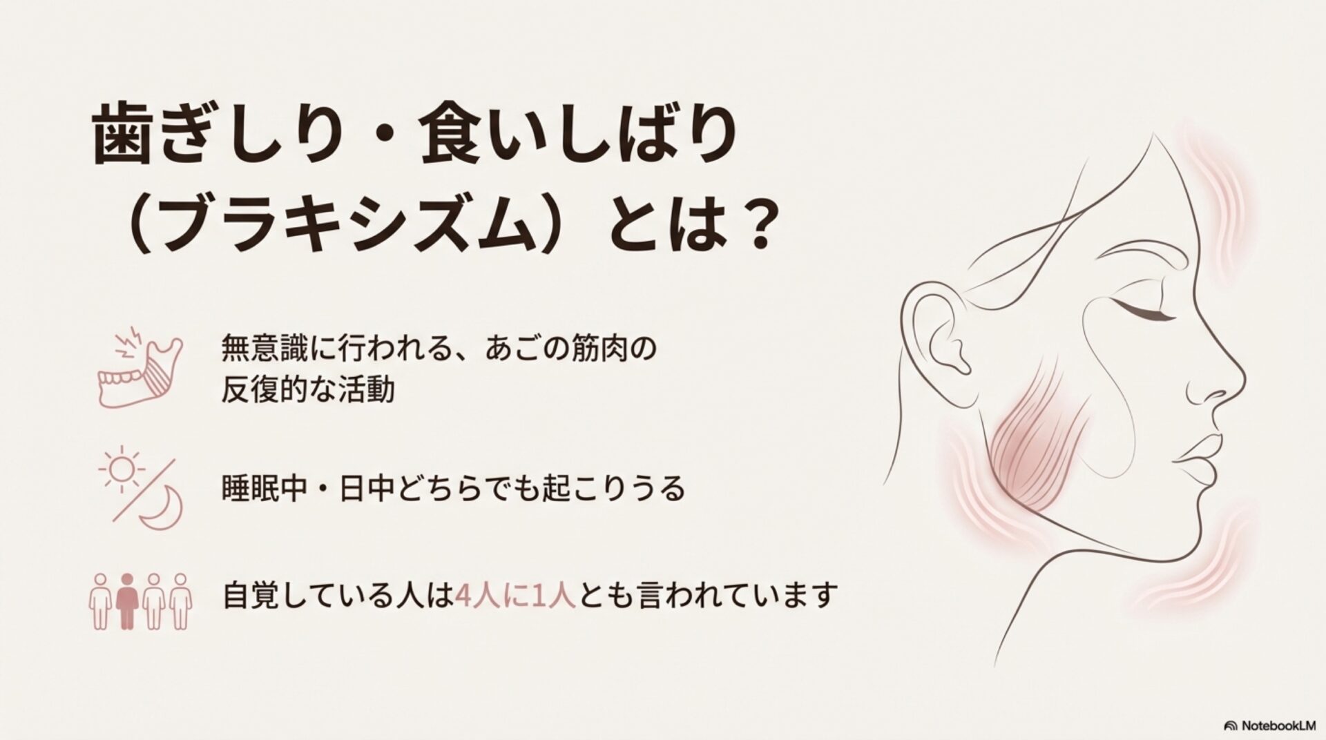 朝、目覚めたときに顎がだるい、なんだか疲れている。あるいは、家族やパートナーから「夜中に歯ぎしりをしているよ」と指摘された経験はありませんか?多くの人が、歯ぎしりを「ただの癖」や「悪い習慣」だと考えがちです。しかし、近年の神経科学的研究は、この常識を覆しつつあります。最新の研究では、歯ぎしりが私たちの脳やストレスと深く関わる、身体からの重要なサインであることがわかってきました。この記事では、その驚くべき5つの真実を解き明かし、あなたの身体が発しているメッセージを読み解くお手伝いをします。
