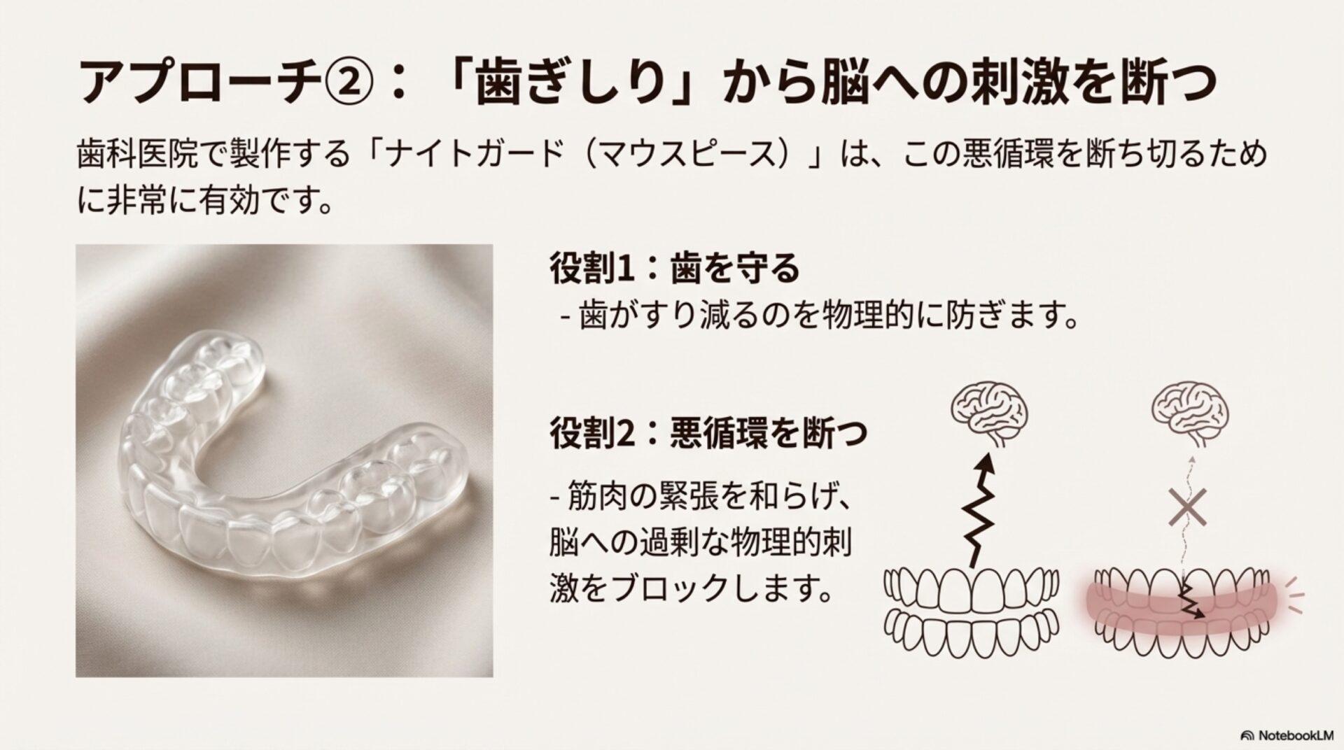 ここまで見てきたように、歯ぎしりは単なる癖ではなく、ストレスと深く結びついた、心と身体からの複雑なメッセージです。それは脳内の化学的な変化から始まり、さらなるストレスを生み出す悪循環を作り出し、時には記憶を司る海馬にまで影響を及ぼす可能性を秘めています。