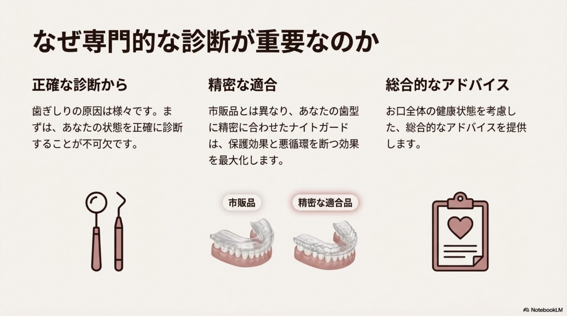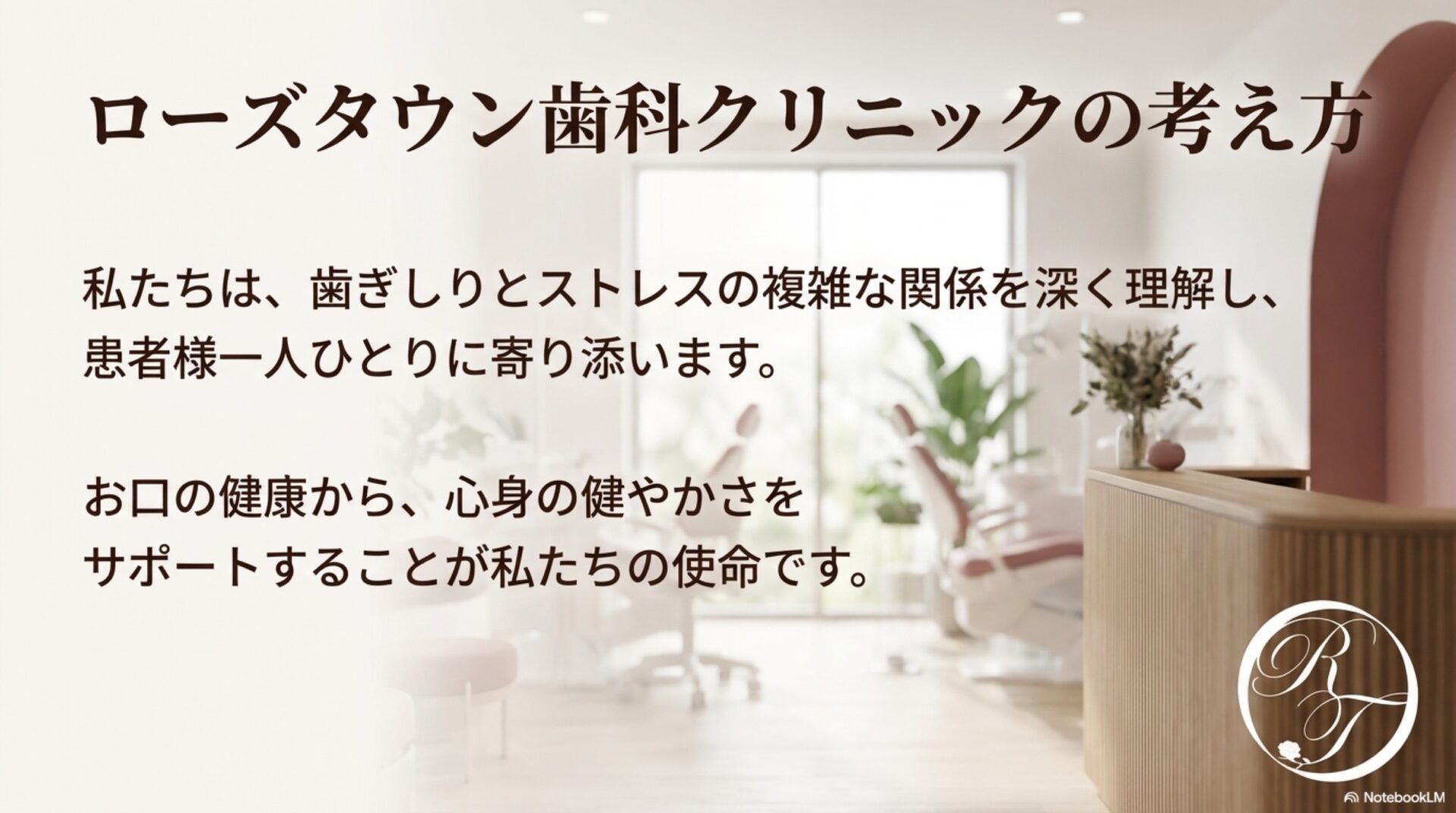 だからこそ、私たちの臨床現場では、単に歯を守るマウスピースをお渡しするだけでなく、ストレスの根本原因を探り、管理していくことを治療計画の重要な柱として位置づけているのです。