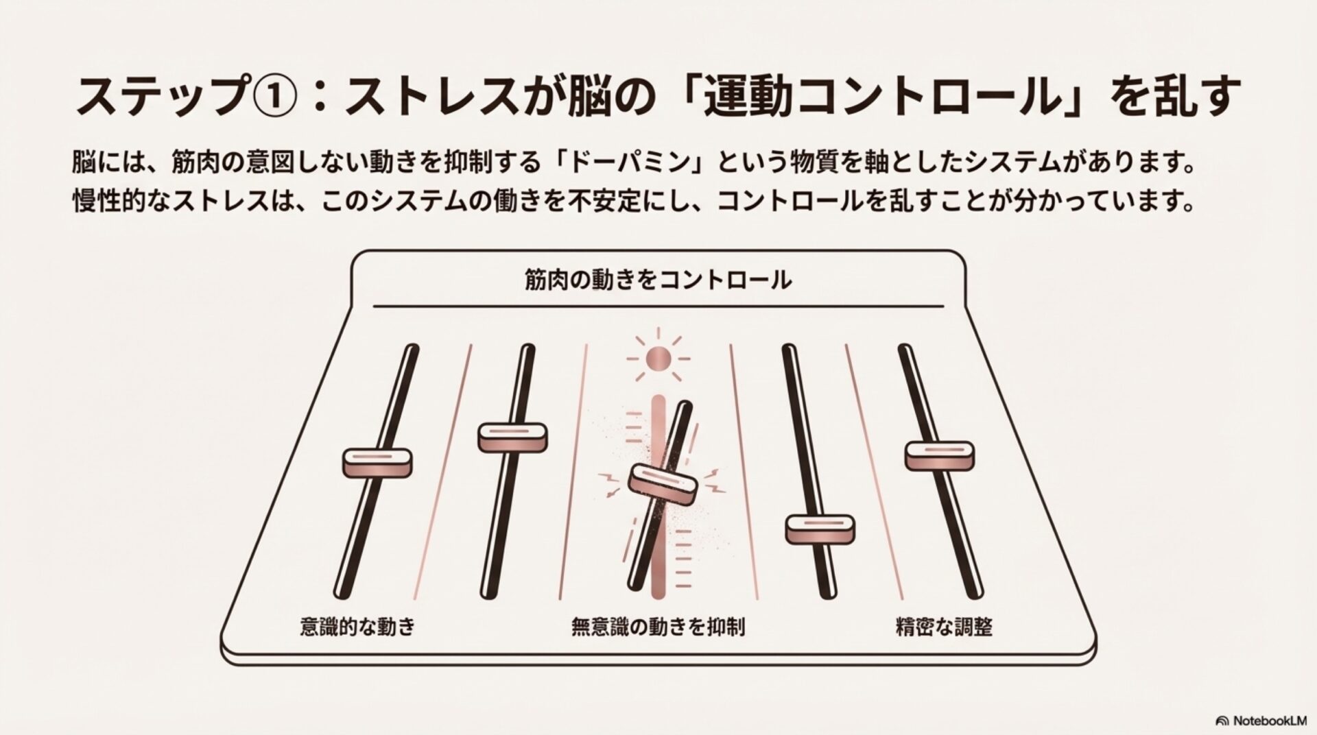これを理解するために、脳の交通整理システムを想像してみてください。ストレスは、脳内で筋肉の動きを精密にコントロールしているこのシステム(神経伝達物質)を混乱させるようなものです。ドーパミンやセロトニンといった信号が正常に機能しなくなると、顎の筋肉に「動け」という誤った指令が送られ続け、無意識の歯ぎしりが始まってしまうのです。つまり、歯ぎしりはあなたの意志とは無関係に、脳がストレスに反応して起こしている身体的な現象なのです。
