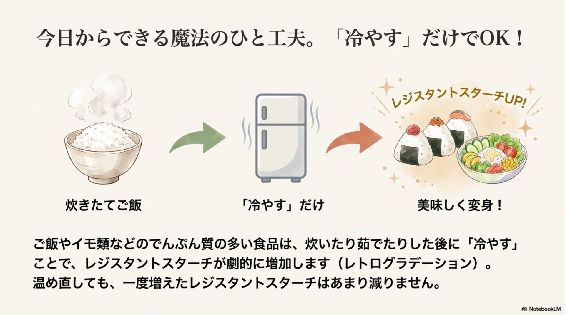 レジスタントスターチのすごいところは、家庭で簡単に増やせる点です。その秘訣は「調理してから冷やす」こと。