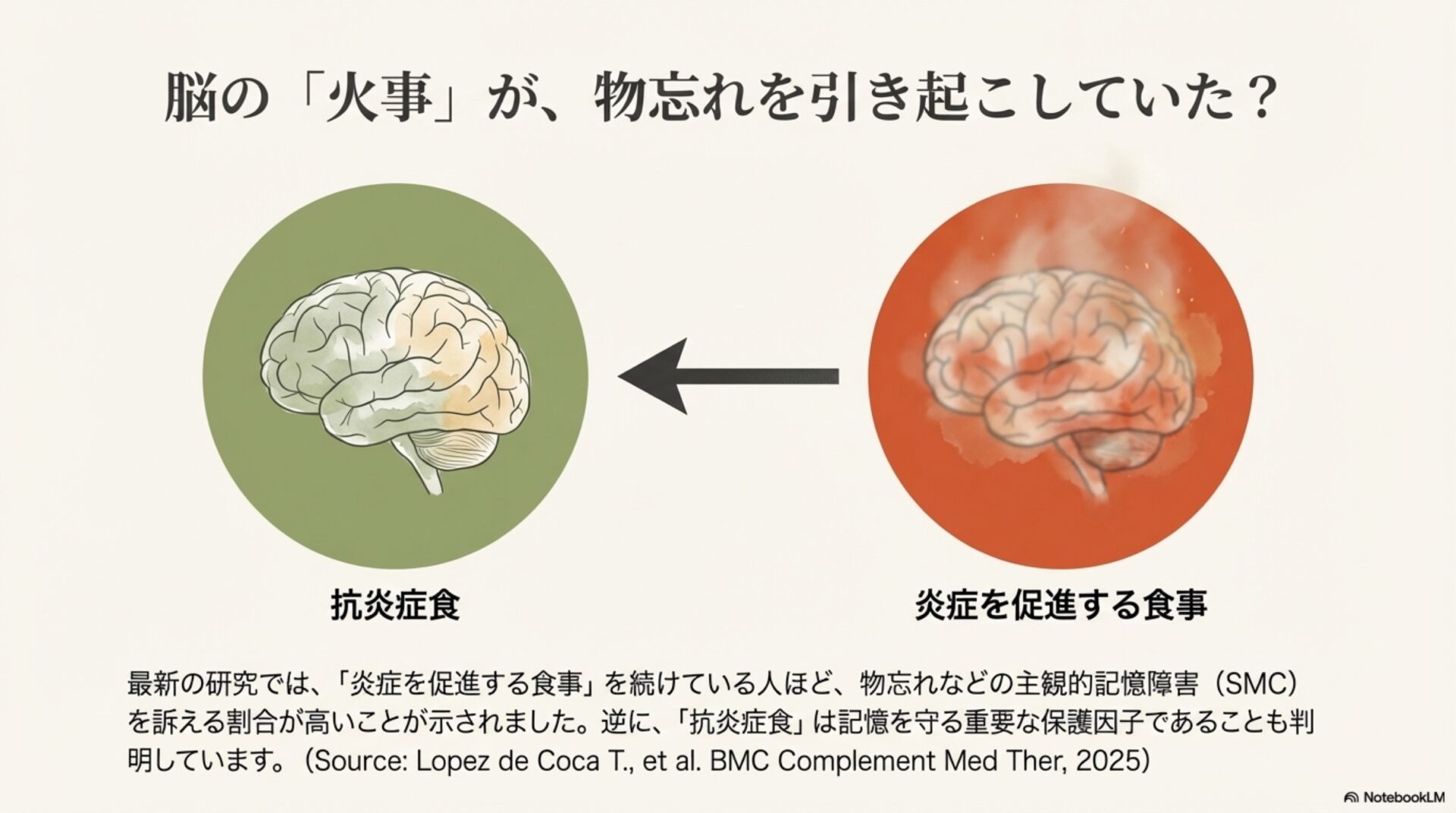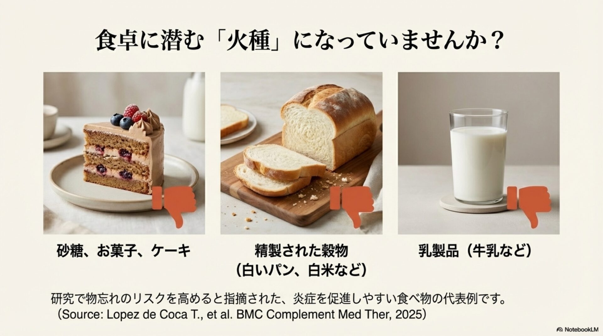 ここで注目したいのは、セクション1で紹介した「AnMED食」が、まさにこの炎症促進性の高い食品(精製穀物、砂糖、赤身肉など)を意図的に避ける食事法であるという点です。