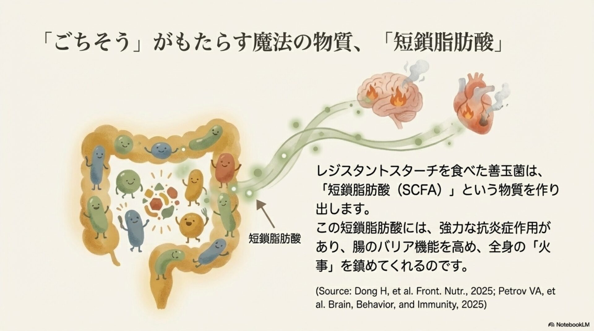 そのメカニズムはこうです。レジスタントスターチは、Faecalibacterium(フィーカリバクテリウム)のような腸内の善玉菌にとって最高のごちそうになります。善玉菌がこれを食べると、短鎖脂肪酸(SCFA)と呼ばれる、体にとって非常に有益な物質を産生します。