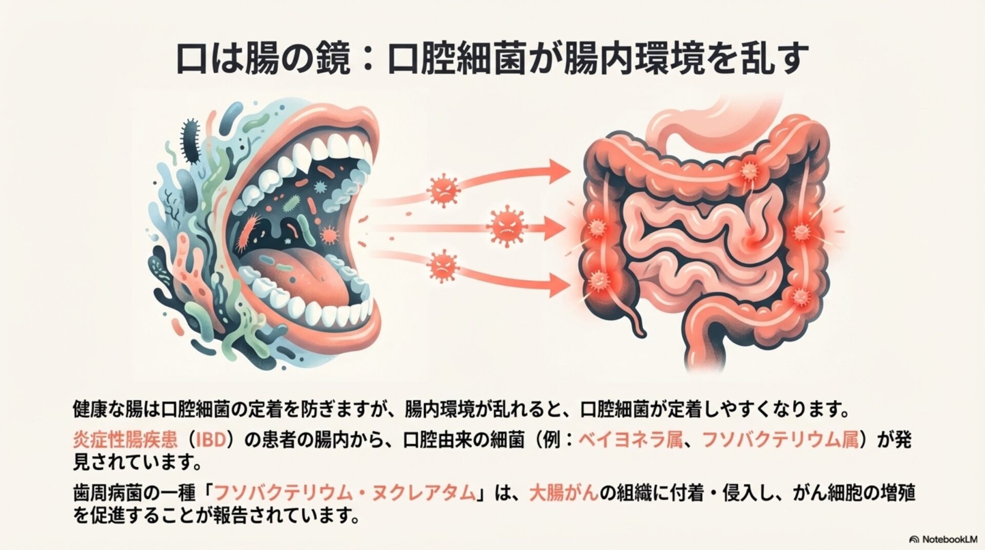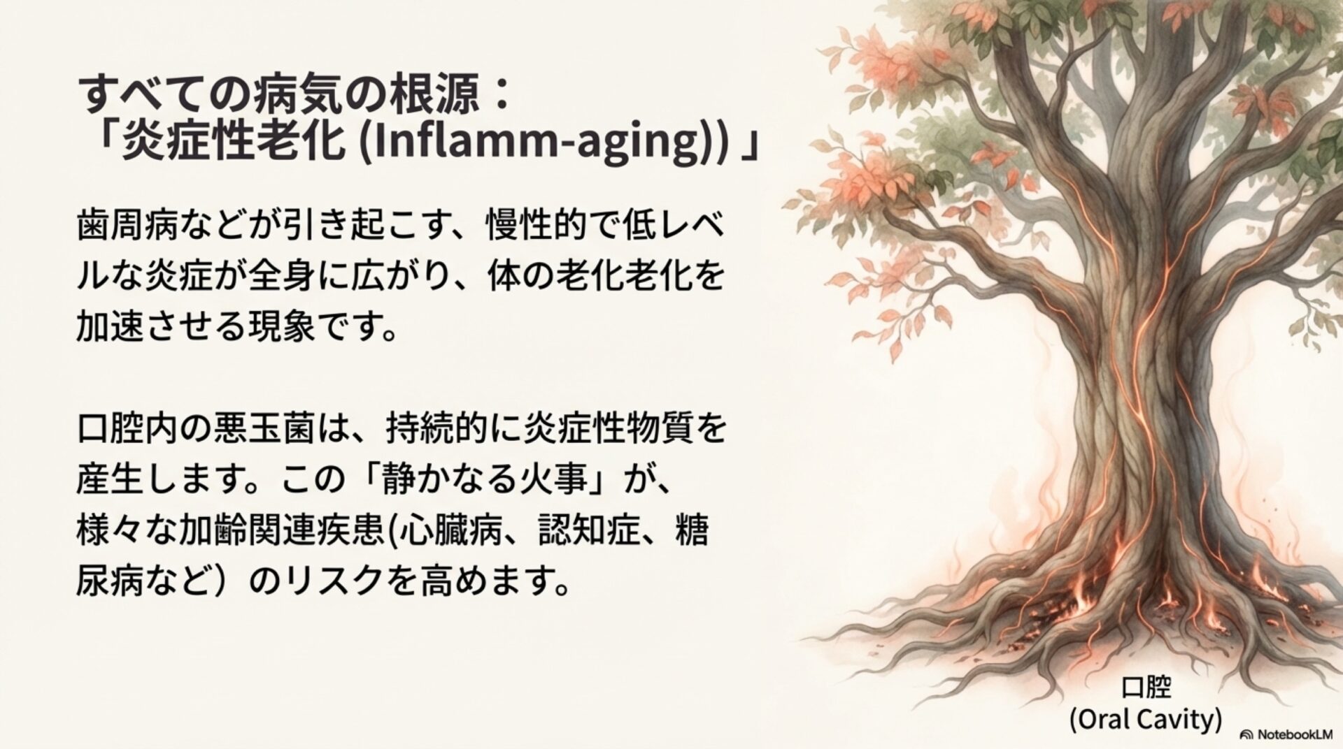 この細菌は、口の中だけの問題にとどまらず、全身の老化に関連する様々な状態と結びついています。