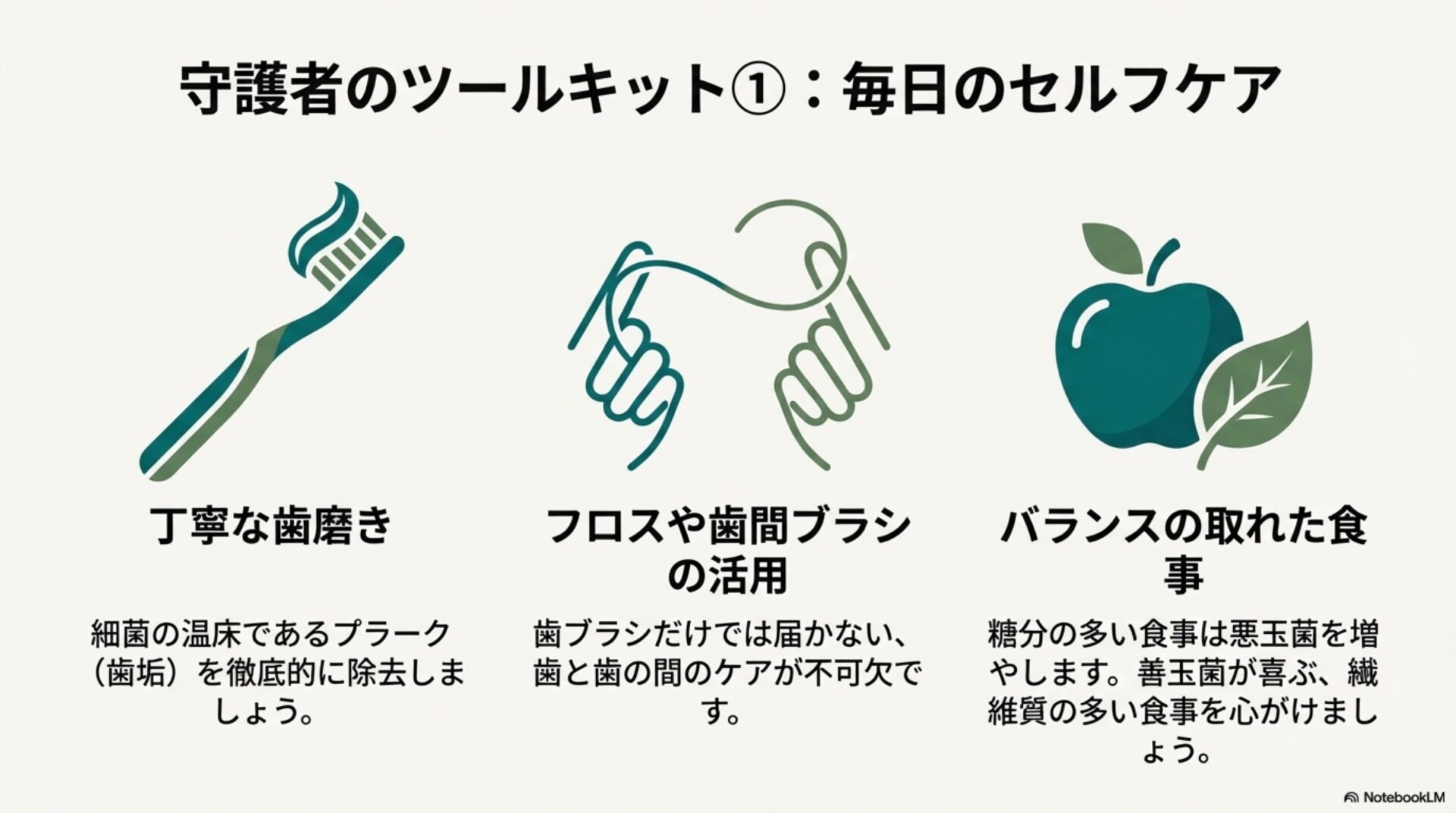 - 歯ブラシとフロスで多様性を守る 優れた口腔衛生を保ち、自身の歯を多く維持することは、有益な微生物の多様性を守ることに直結します。これは、歯周病や虫歯を引き起こす病原菌の侵入を防ぐための、最も基本的かつ強力な防御策です。