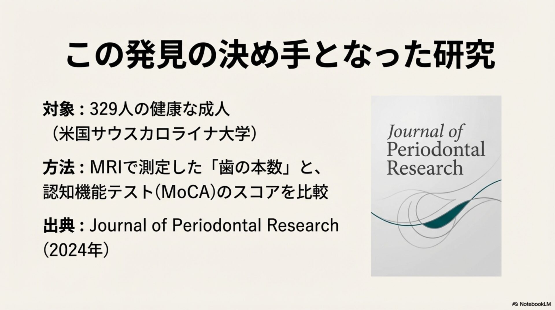 研究では、広く使われている「モントリオール認知評価(MoCA)」というテストが用いられました。これは記憶力、注意力、言語能力といった、脳の様々な働きをチェックするための総合的なテストです。年齢、性別、人種といった他の要因の影響を取り除いて分析しても、歯の本数と認知機能スコアの間のこの強固な関係は揺らぎませんでした。この結果は、歯の健康が単なる口の問題ではなく、脳全体の機能と深く結びついている可能性を力強く示唆しています。