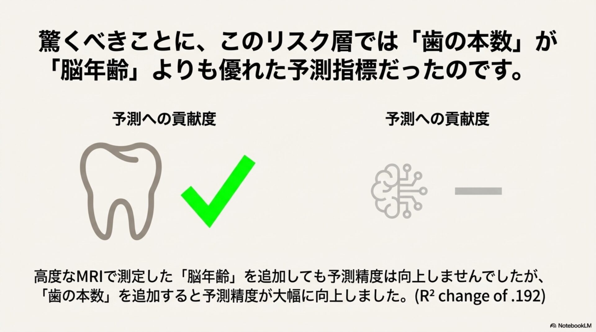 ここで、非常に直感に反する驚きの結果が明らかになりました。認知機能スコアを予測するモデルに「歯の本数」のデータを加えると、モデルの予測精度は大幅に向上しました。一方で、「脳年齢ギャップ」のデータを加えても、予測精度は全く改善されなかったのです。これは、少なくともこの研究においては、認知機能を予測するために、推定された脳の年齢よりも、実際の歯の本数の方がはるかに価値のある情報であったことを意味します。