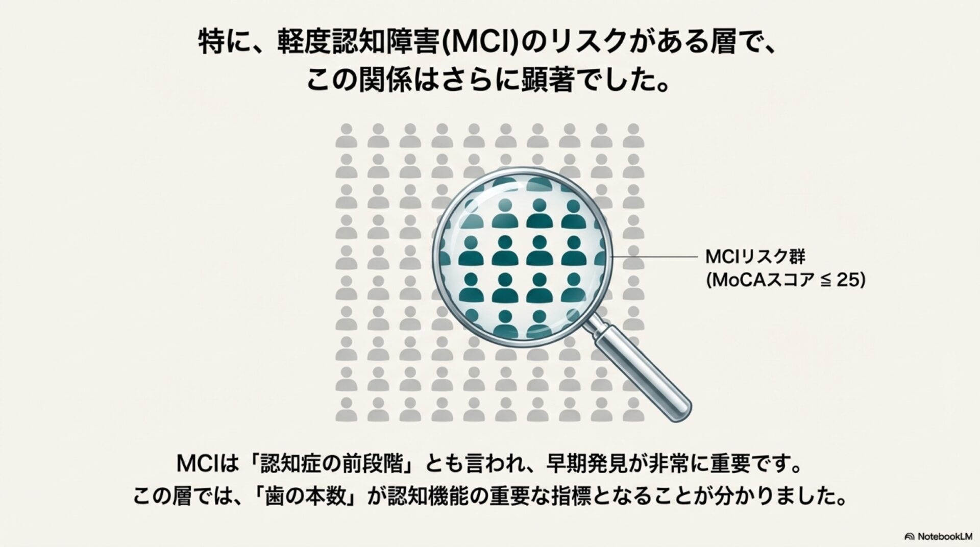 歯の喪失と認知機能の関連性は、ある特定のグループにおいて特に顕著でした。それは、MoCAのスコアから「軽度認知障害(MCI)」のリスクがあると判断された人々です。軽度認知障害とは、記憶力や思考能力に明らかな低下が見られるものの、まだ日常生活に深刻な支障をきたすには至っていない状態を指します。