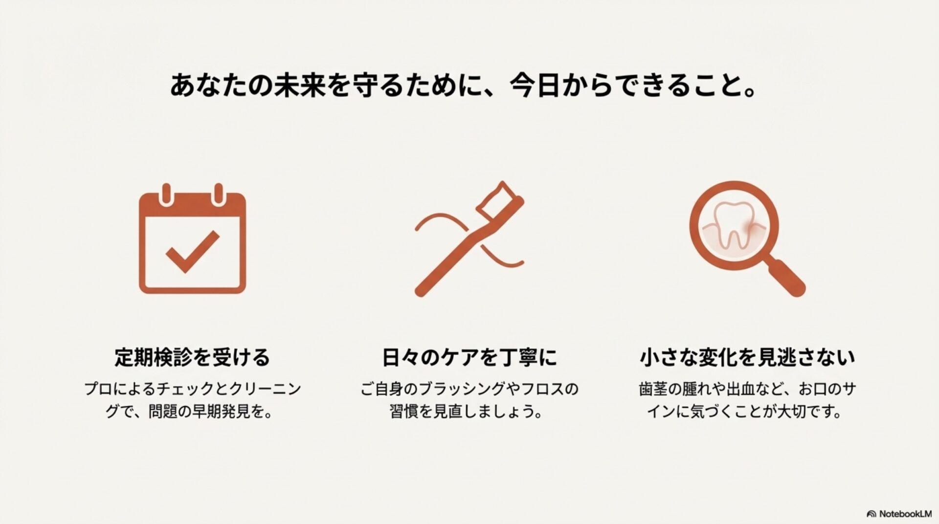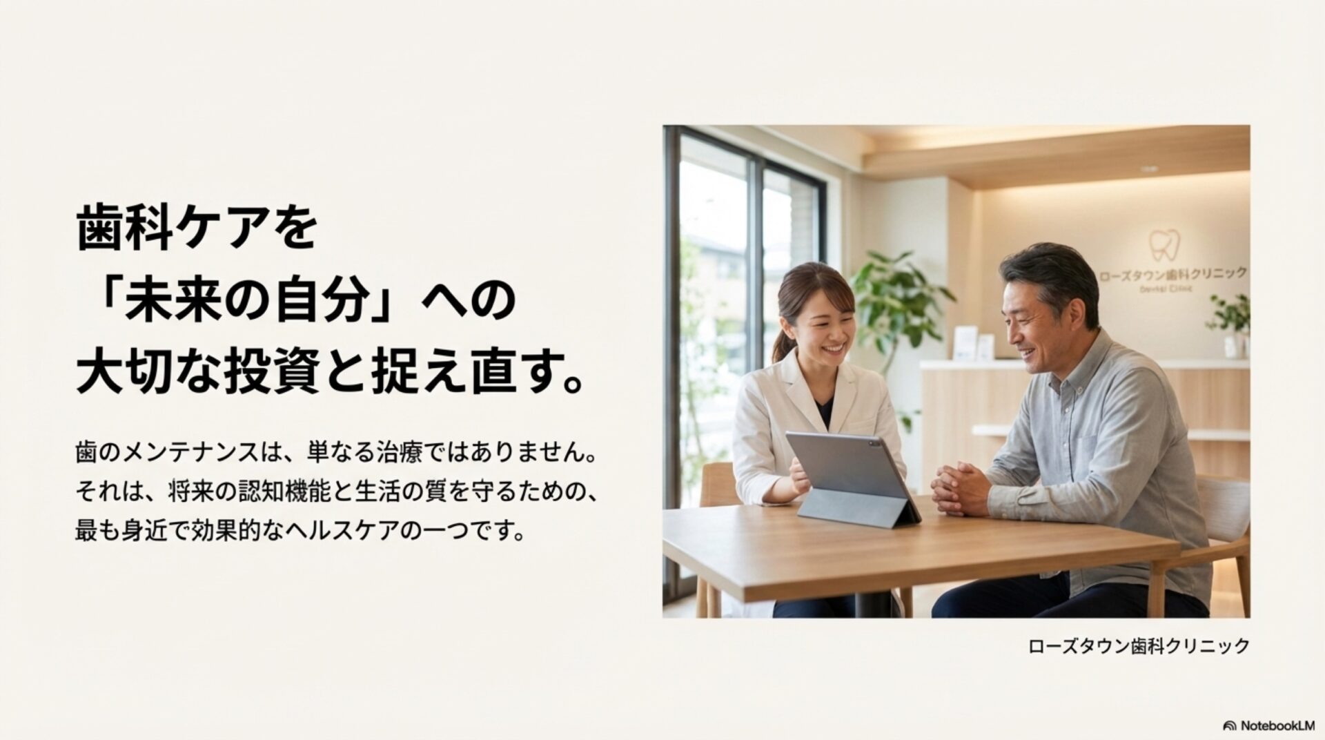 今回の研究が私たちに伝える最も重要なメッセージは、口腔の健康、特に生涯を通じて維持する歯の本数は、単に食事や笑顔のためだけのものではない、ということです。それは、私たちの脳の健康状態を示す強力な指標となり得るのです。