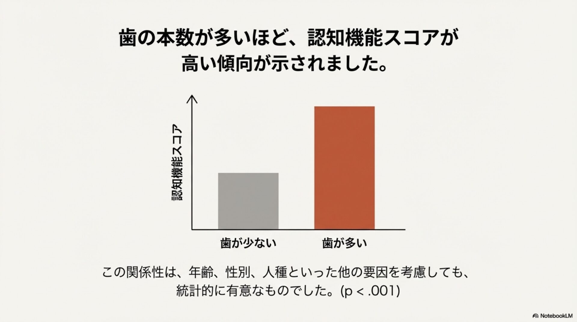 この研究が明らかにした最も重要な発見は、「歯の本数」と「認知機能テストのスコア」の間に、統計的に非常に有意な正の相関関係があったことです。これは、この結果が偶然得られたものではなく、歯の本数と認知機能の間に本質的な関連があることを強く示唆しています。つまり、残っている歯の本数が多い人ほど、認知機能が高い傾向にあることが示されたのです。