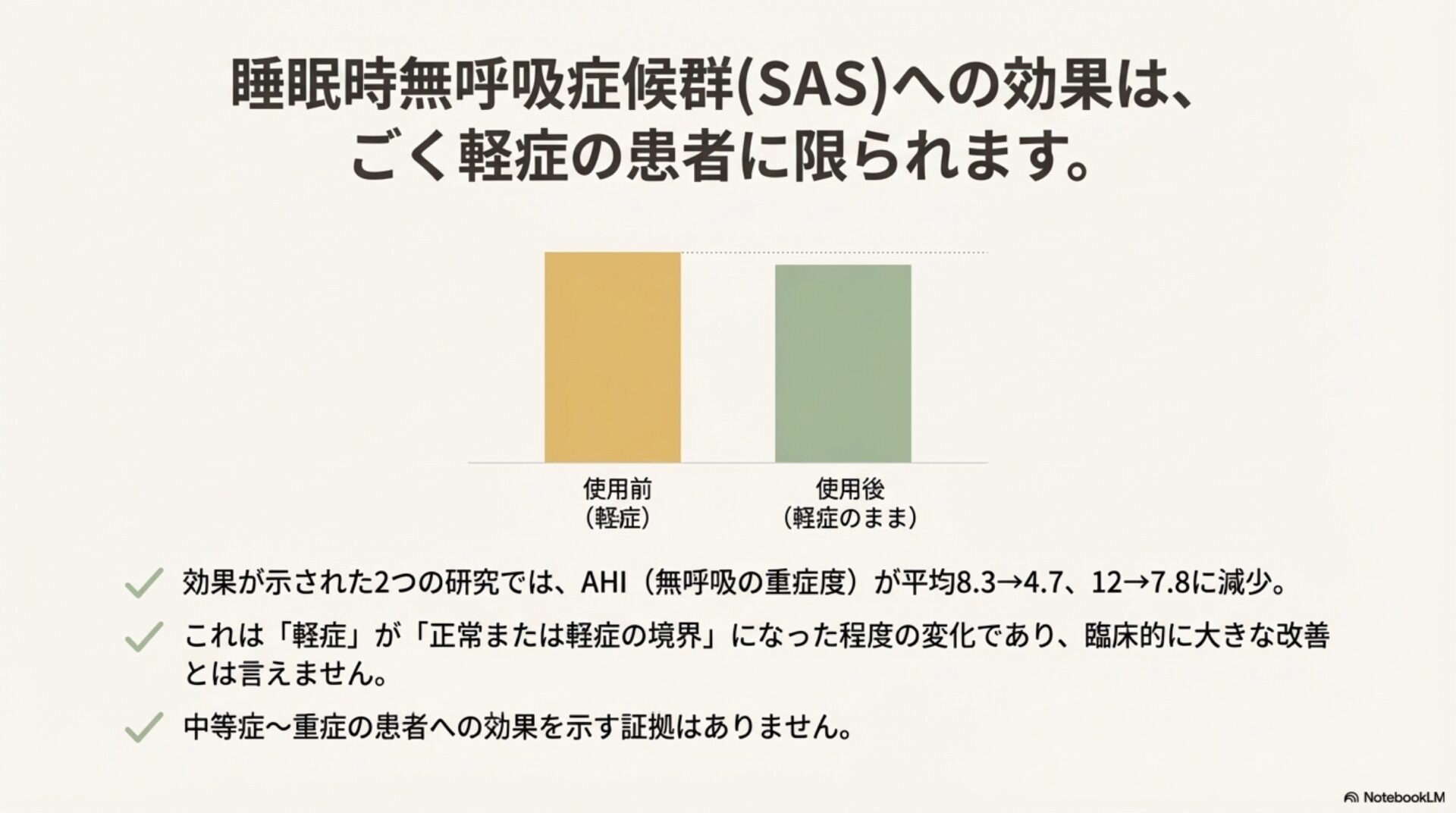 しかし、この効果が確認されたのは「軽症」の閉塞性睡眠時無呼吸症候群(OSA)の患者に限られていました。さらに、その改善効果も臨床的に大きな意味を持つとは言えません。例えば、Lee氏らの研究ではAHIが8.3から4.7に(「軽症」から「軽症のボーダーライン」へ)、Huang氏らの研究では12から7.8に(依然として「軽症」の範囲内)改善したに過ぎず、その効果は限定的です。
