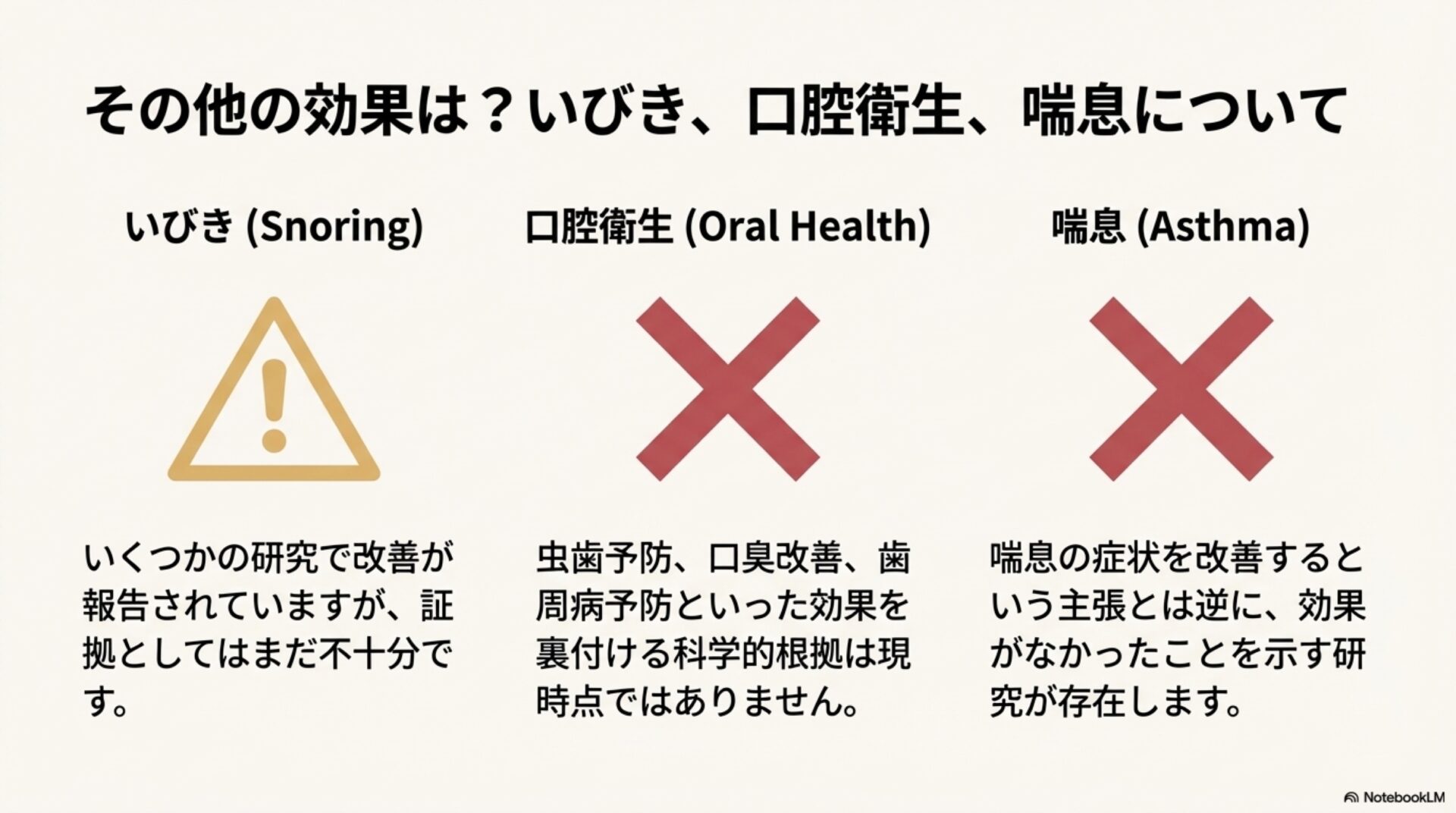 3. 事実3:虫歯・口臭予防など、口腔健康への効果は科学的に「未証明」