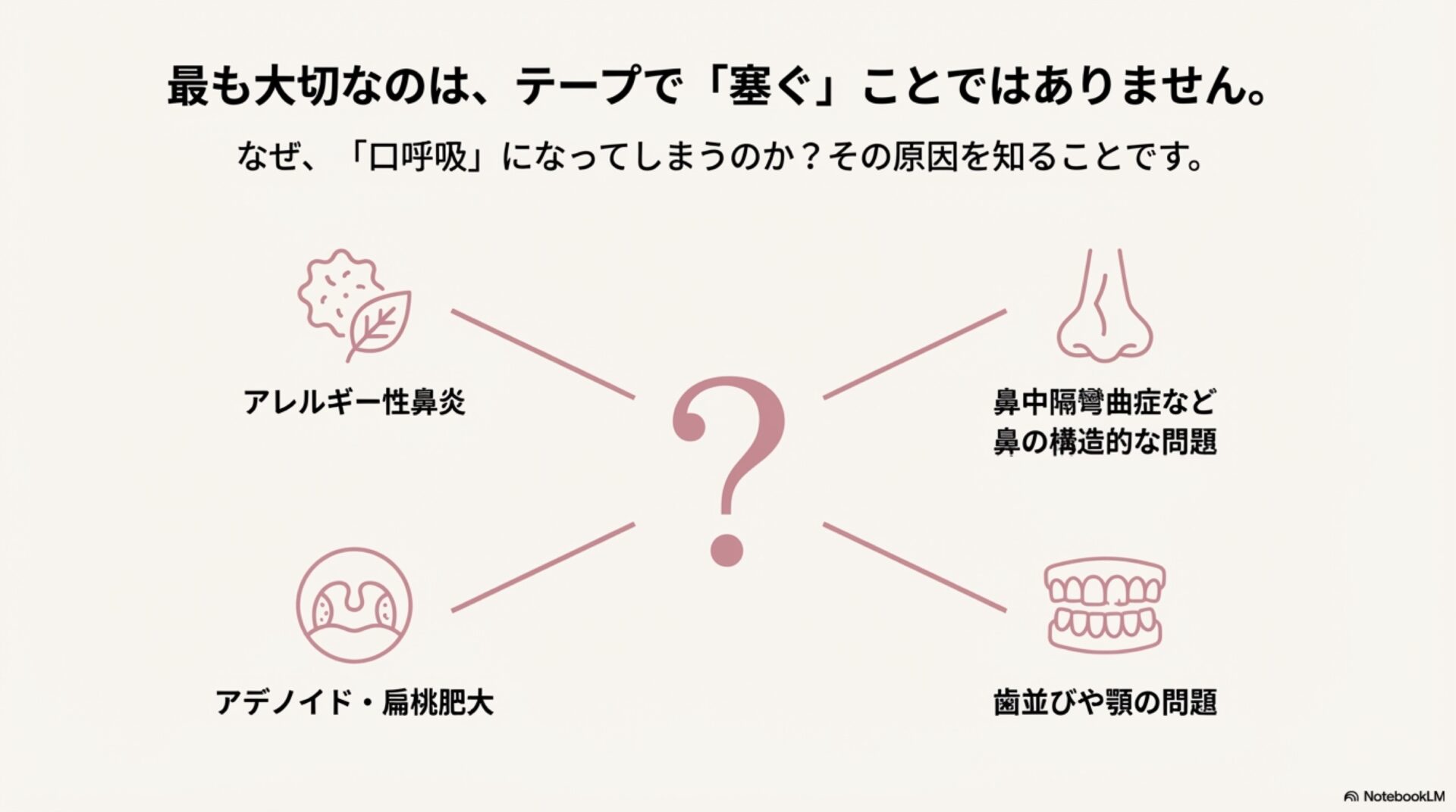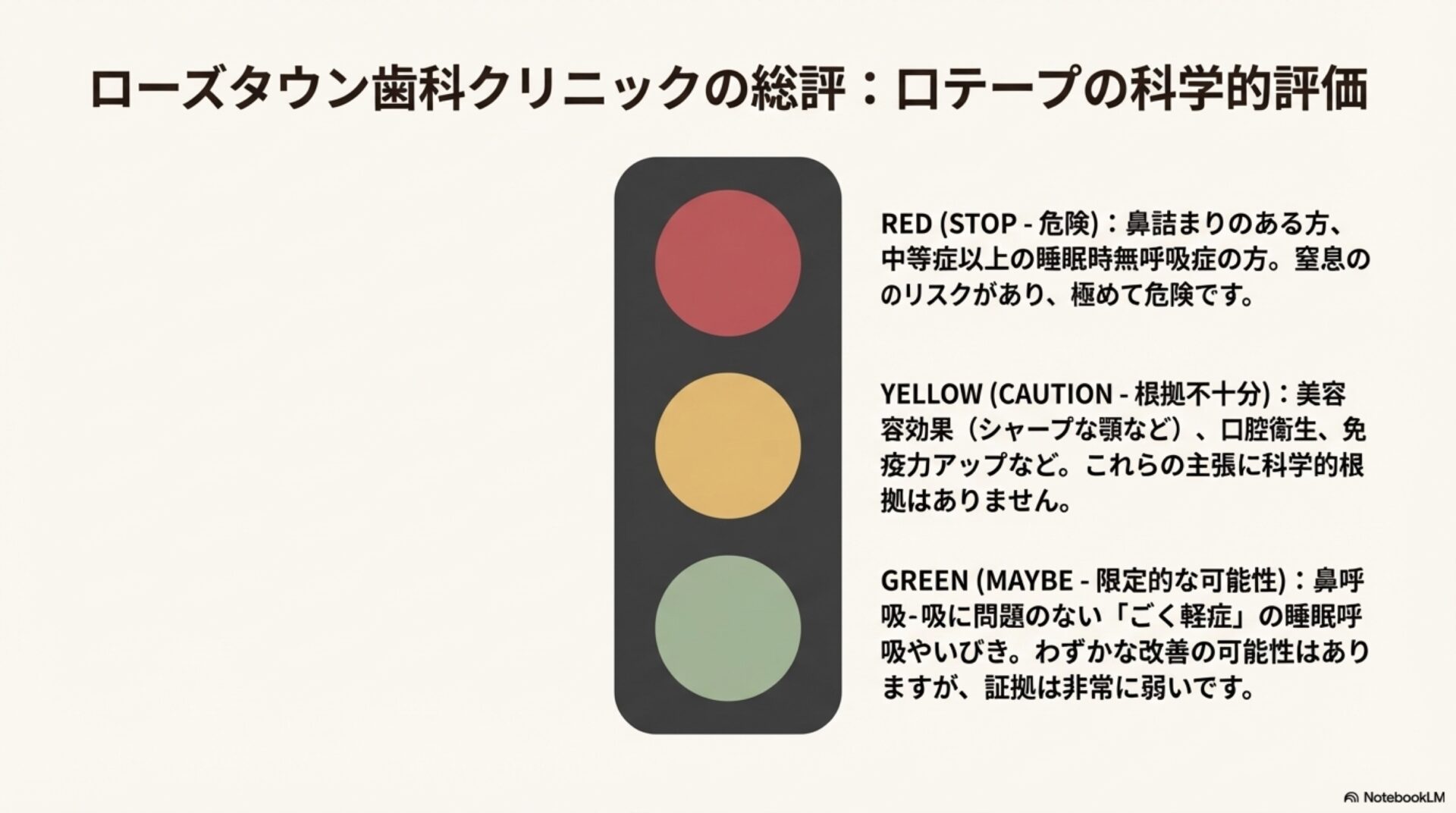 鼻呼吸を促進することは、健康上、非常に有効な目標です。しかし、現在の科学的エビデンスは、口テープが一般の人々にとって安全かつ効果的な方法であるとは支持していません。