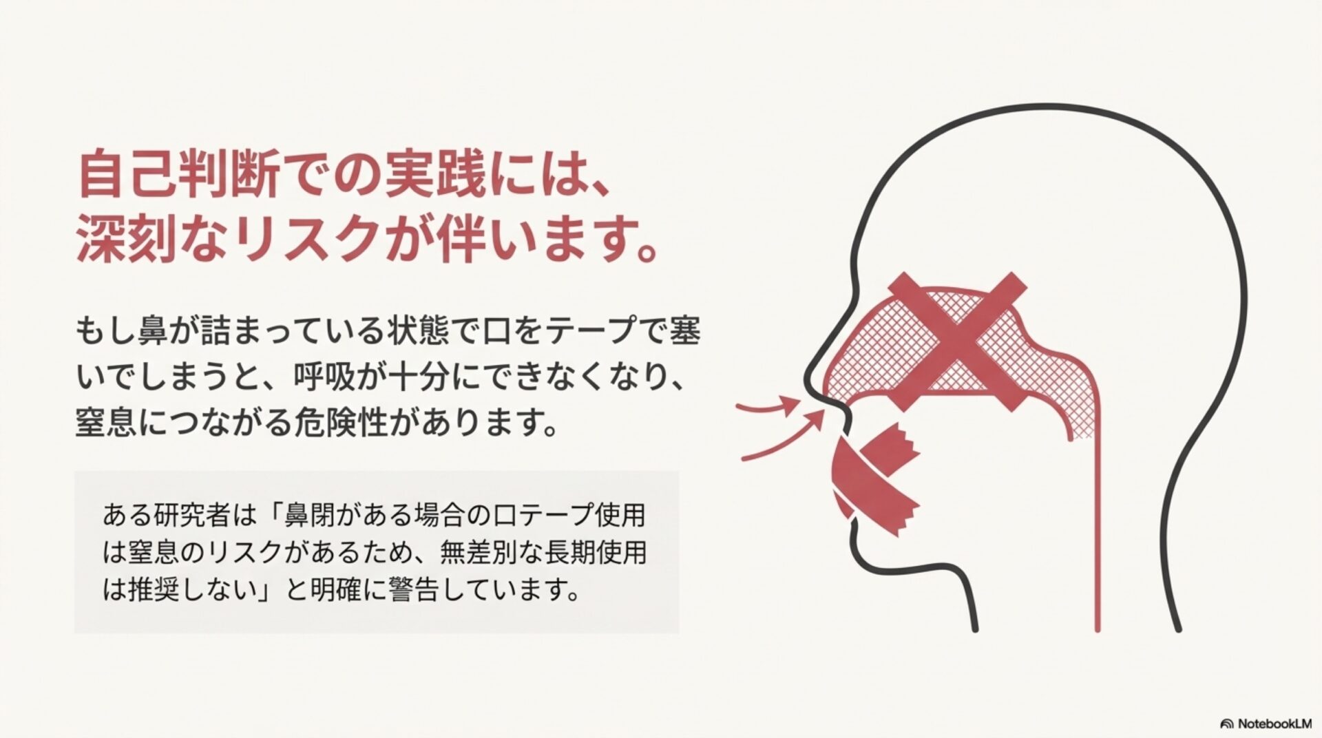 同レビューでは、複数の研究が鼻づまりのある人における「深刻な窒息リスク」について明確に警告していると述べています。鼻が詰まっている状態で口を物理的に塞ぐ行為が、いかに危険であるかは想像に難くないでしょう。