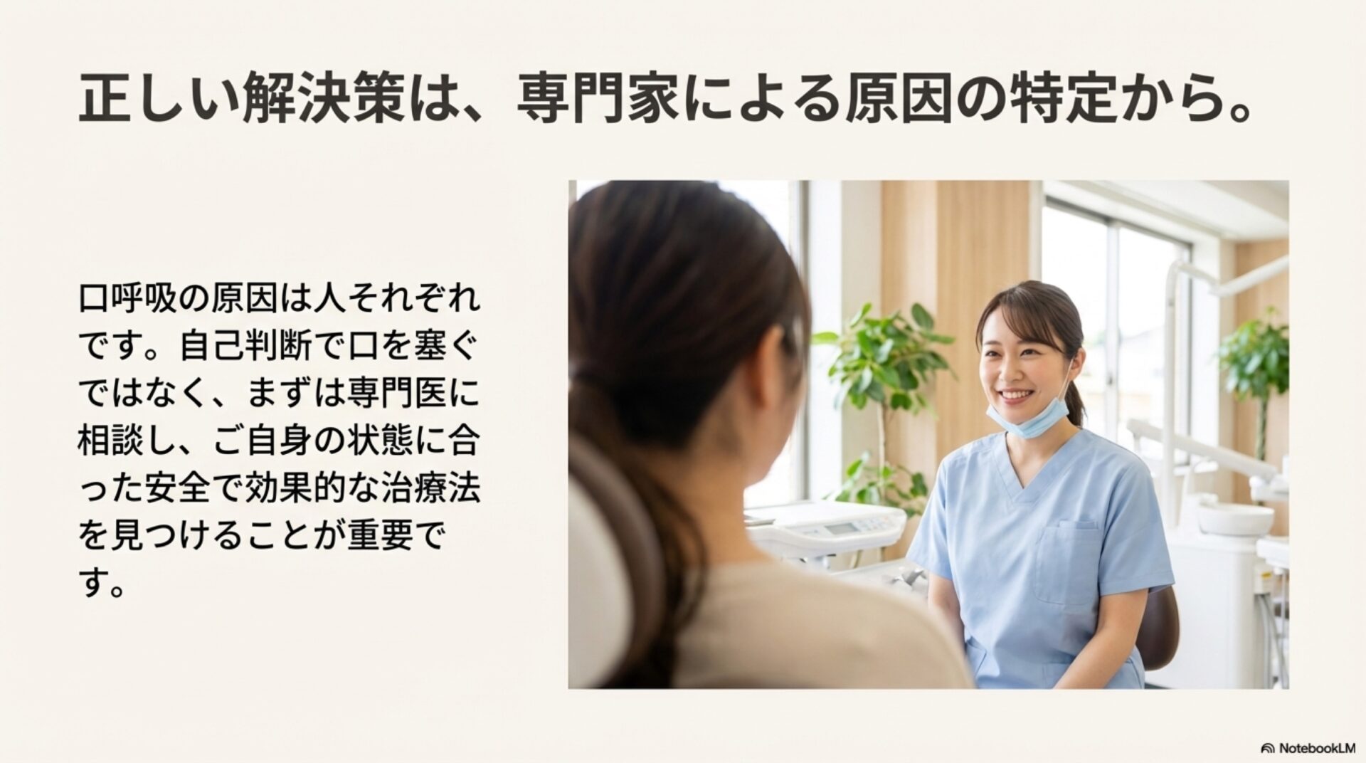 もしあなたが口呼吸、いびき、睡眠の質について懸念があるのなら、リスクのあるSNSのトレンドを試す前に、医師や歯科医師といった専門家に相談すべきです。あなたの健康を守る最も確実な道は、自己判断で安易な方法に頼るのではなく、専門的な診断と指導を求めることです。