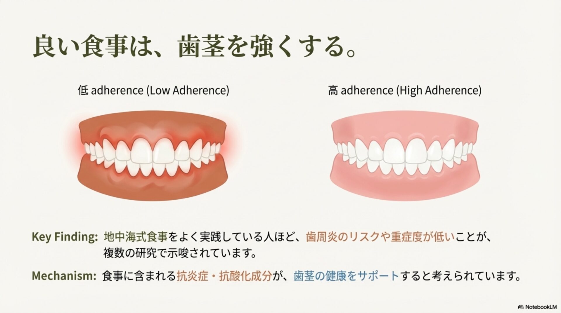 地中海式食事を熱心に実践している人は、歯周病のリスクや重症度が低いことが、近年の複数の系統的レビューによって実証されています。歯周病は、世界中の成人の約60%が罹患していると言われる身近な問題であり、その予防は口腔内だけでなく全身の健康維持に不可欠です。