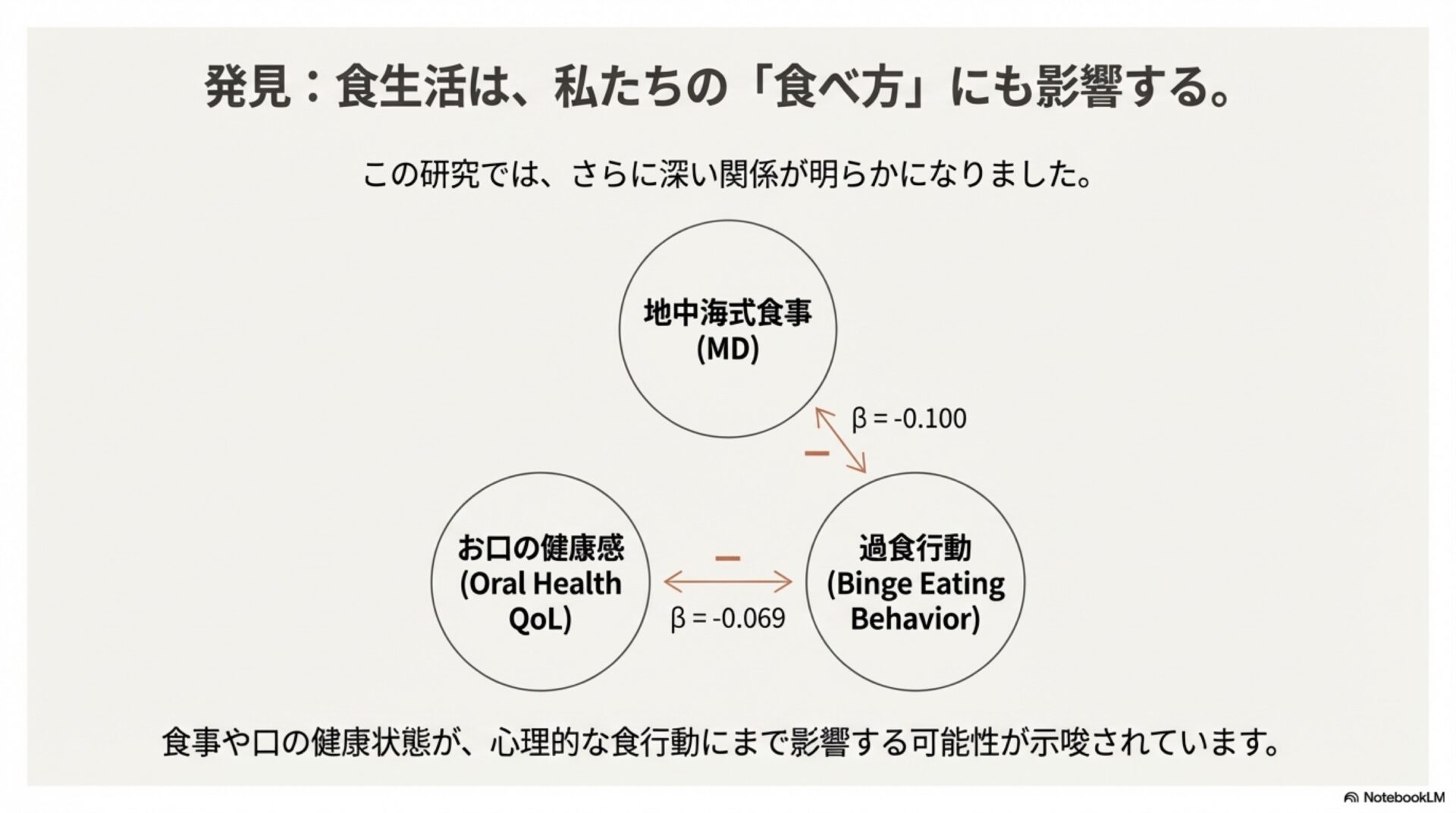 驚くべきことに、地中海式食事が「過食(Binge Eating)」と呼ばれる衝動的な食べ過ぎを抑制するのに役立つ可能性が、歯周病との関連を調査した研究からも示唆されています。ある1000人以上の成人を対象とした研究では、地中海式食事の遵守度が高いほど、過食行動のスコアが低いという有意な負の相関関係(r = -0.112)が確認されました。