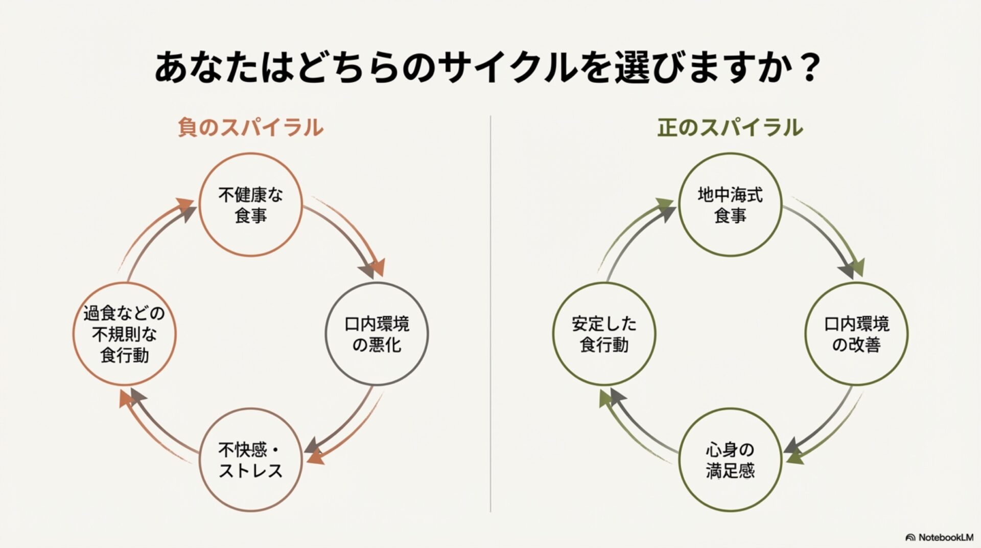 地中海式食事が歯周病リスクの低下や過食行動の抑制に関係するという最新の研究は、食事が私たちの心身の健康にどれほど深く、そして多角的に影響を与えるかを示しています。この記事では、科学的根拠に基づき、地中海式食事がもたらす意外と知られていない5つの健康効果を専門家が解説します。口の中から脳、そして心の健康まで、この食事が私たちの生活全体をいかに豊かにしてくれるかを見ていきましょう。