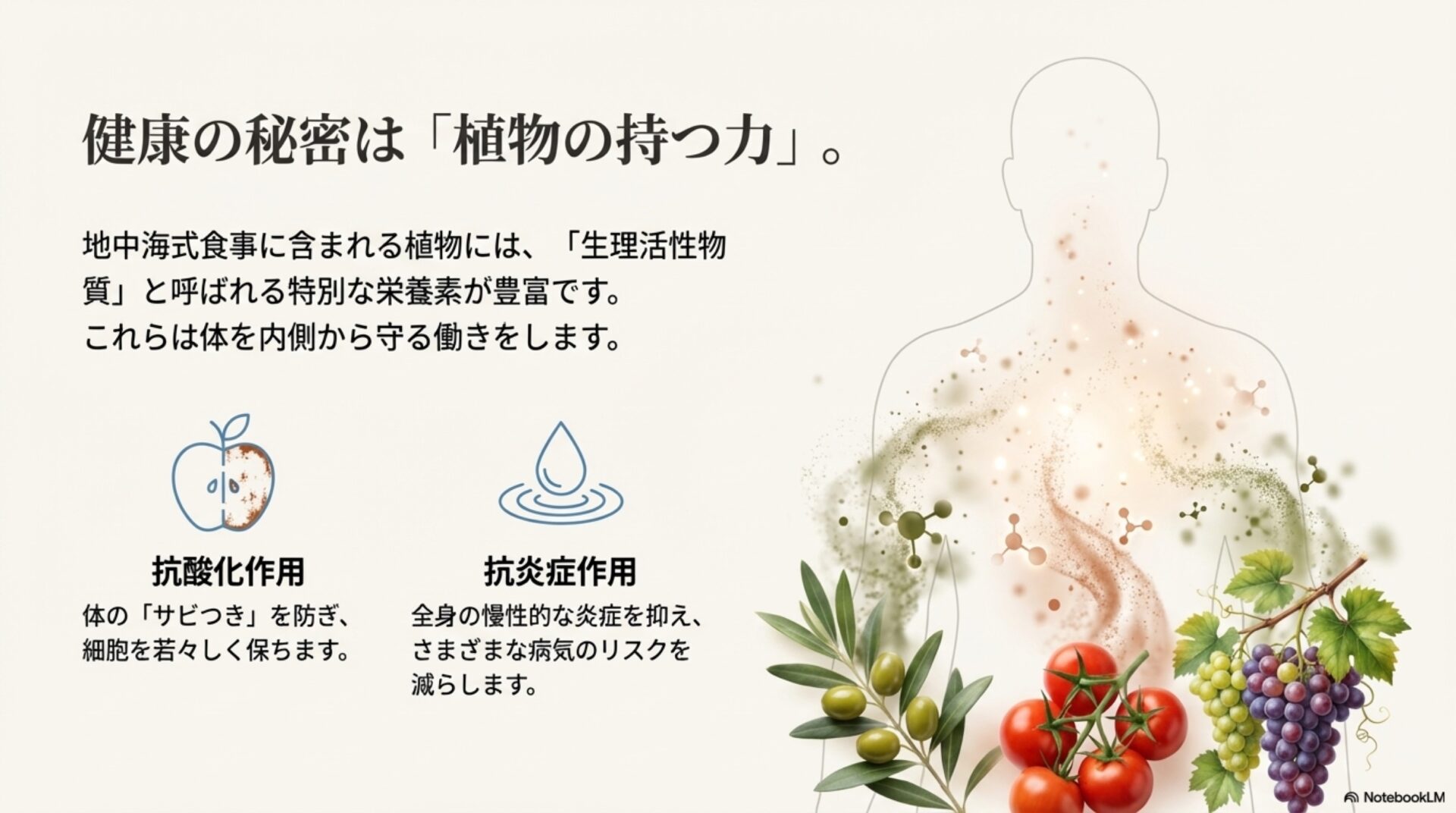地中海式食事に含まれる食品は、「生物活性分子(Bioactive molecules)」の宝庫です。これは、ポリフェノールやカロテノイドといった天然の化合物で、私たちの体内で強力な抗酸化物質や抗炎症物質として機能し、いわば「体のサビつき」である酸化ストレスから細胞を守ってくれます。