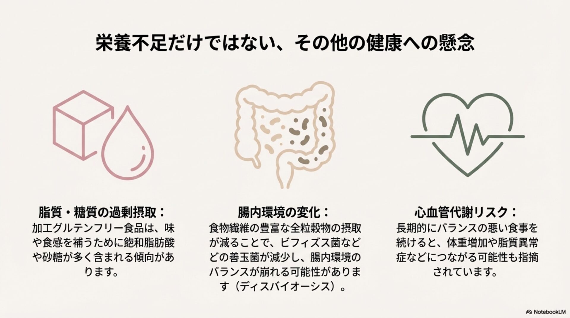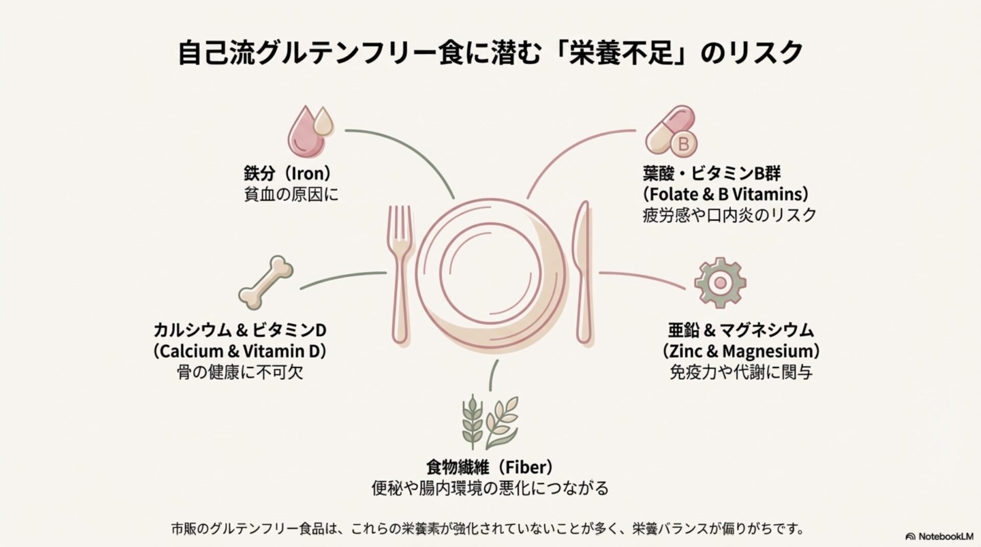これは皮肉な状況です。多くの人が健康のためにグルテンフリー・ダイエットを始めますが、専門家の指導なしに加工品に頼りすぎると、かえって栄養価の低い食事になり、栄養不足のリスクを高めてしまう可能性があるのです。つまり、ただグルテンを避けるだけでは不十分で、何を代わりに食べるかが健康の分かれ道になるのです。