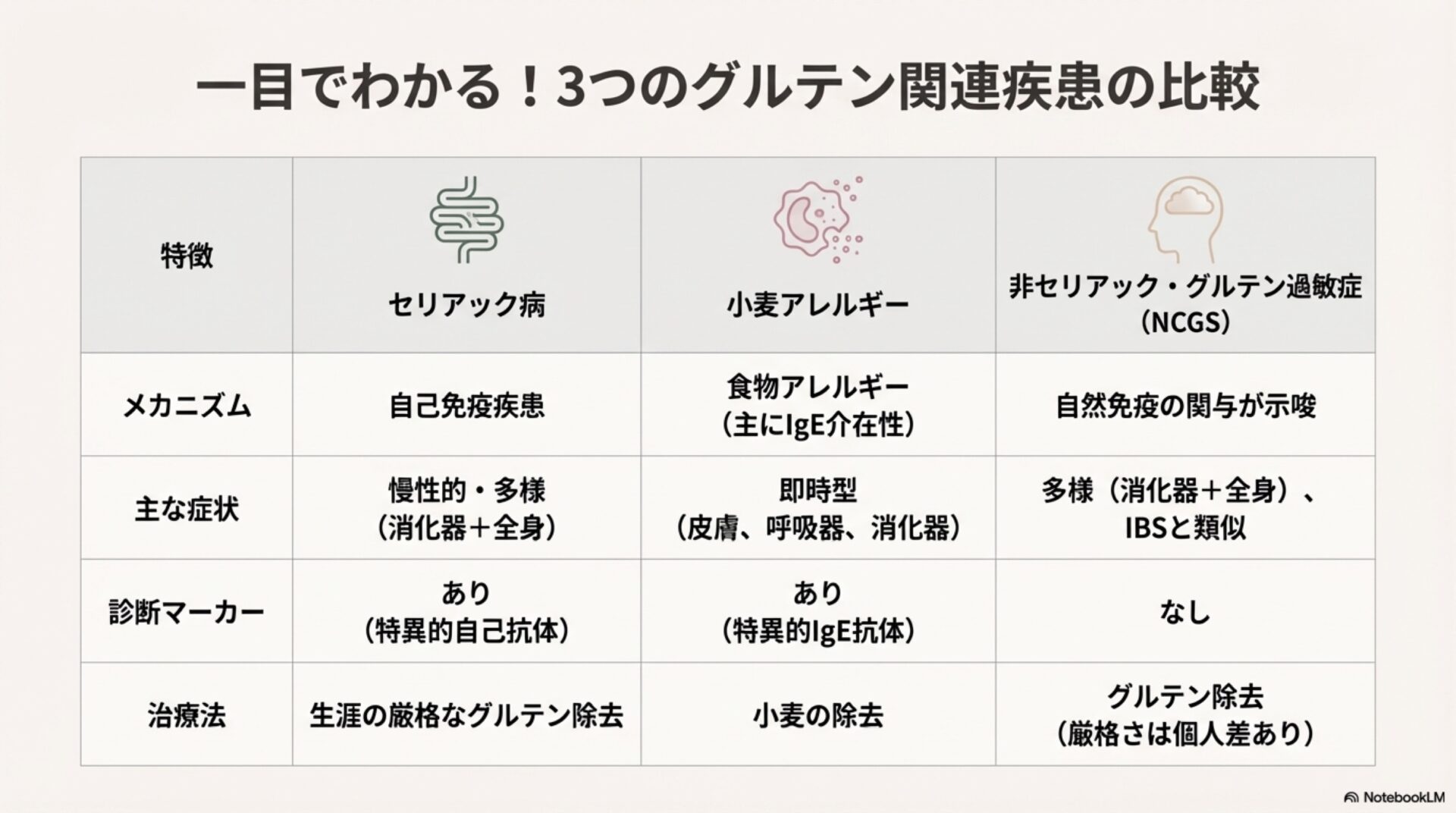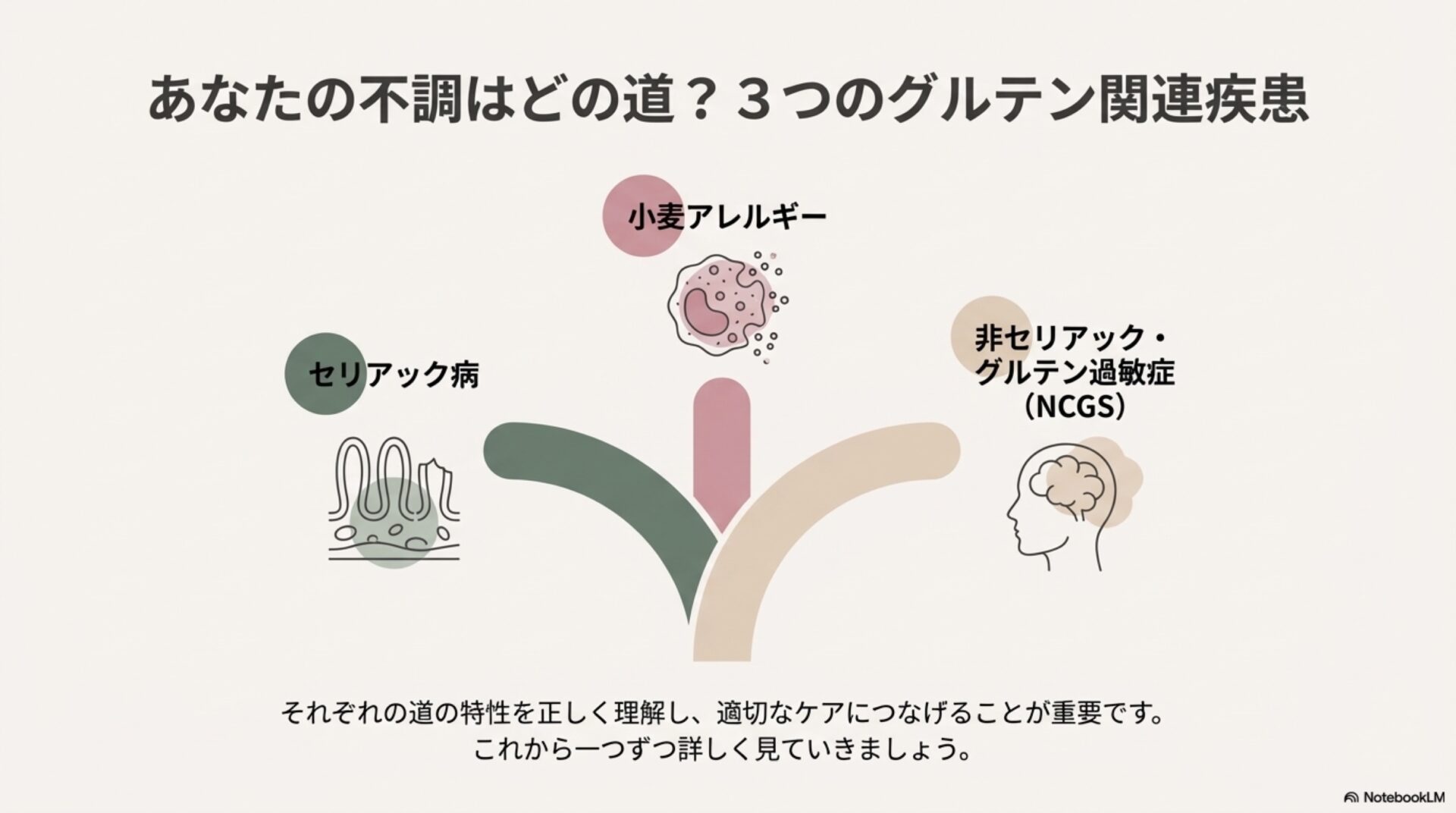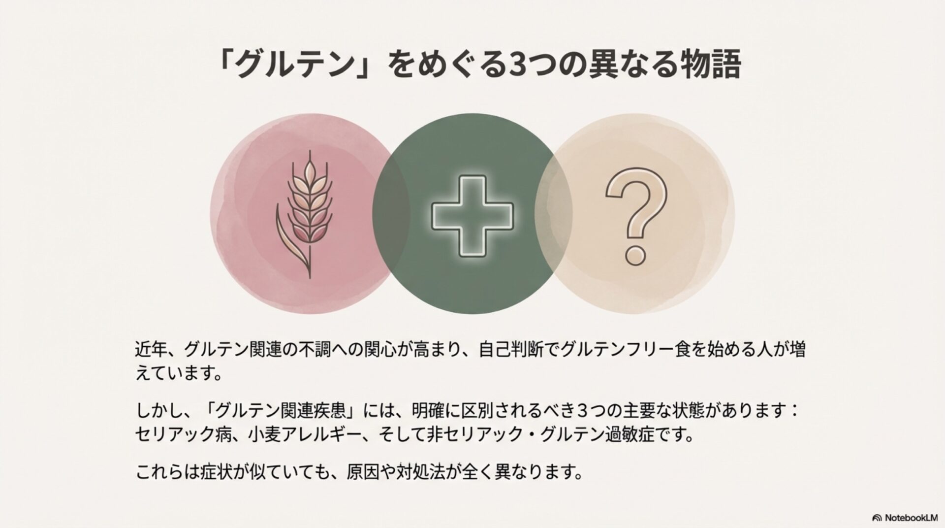 「グルテンが体に合わない」と感じる時、私たちはそれを一つの問題として捉えがちですが、医学的にはグルテン関連の不調は主に3つの異なる状態に分類されます。