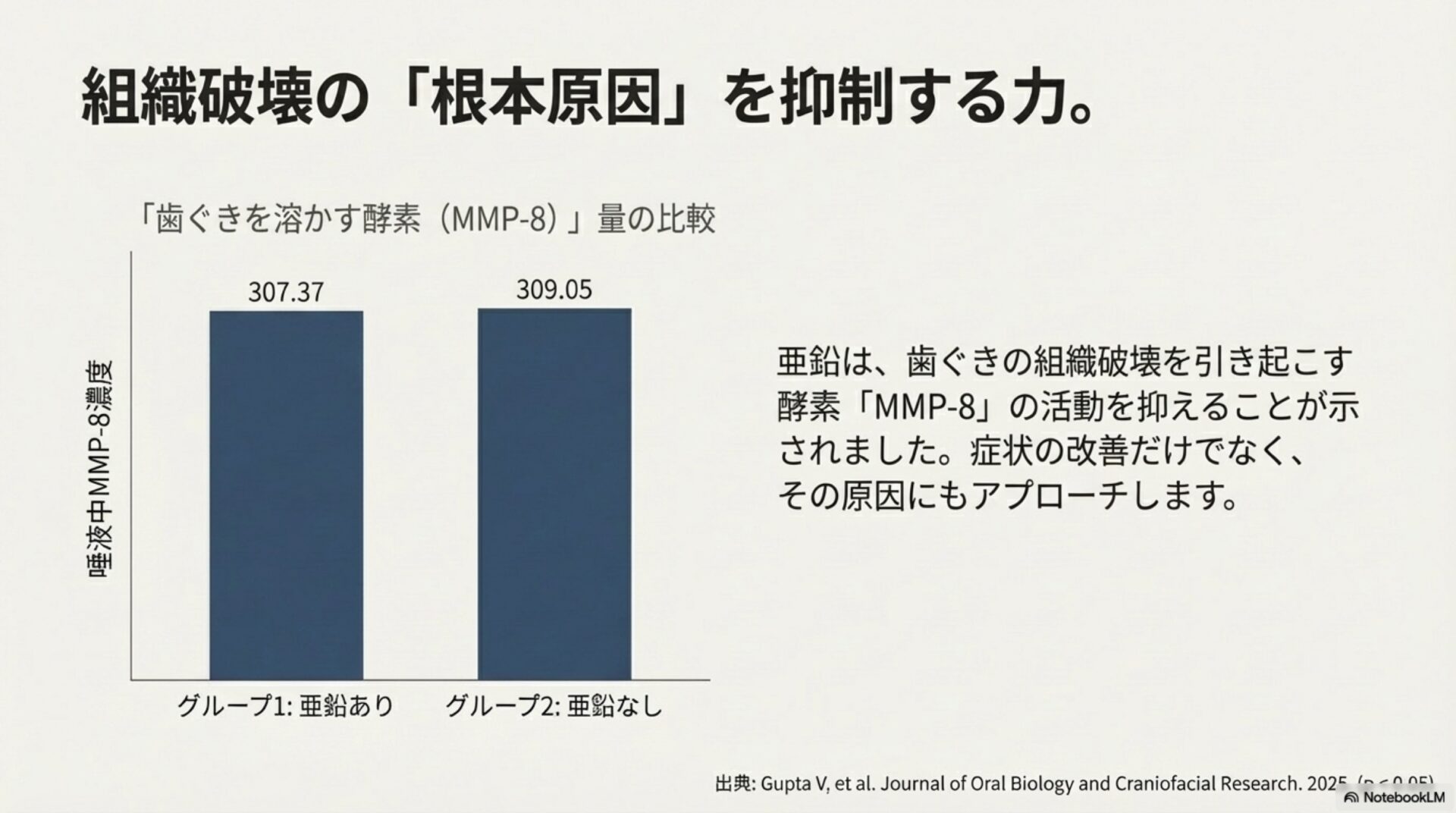 - 亜鉛は、MMP-8が正常に機能するためには不可欠な要素ですが、歯周病のようにMMP-8が過剰に産生された場合には、その破壊的な活動を抑制するブレーキ役としても機能します。この絶妙な調節機能が、歯周病治療において有益な効果をもたらす鍵となります。
