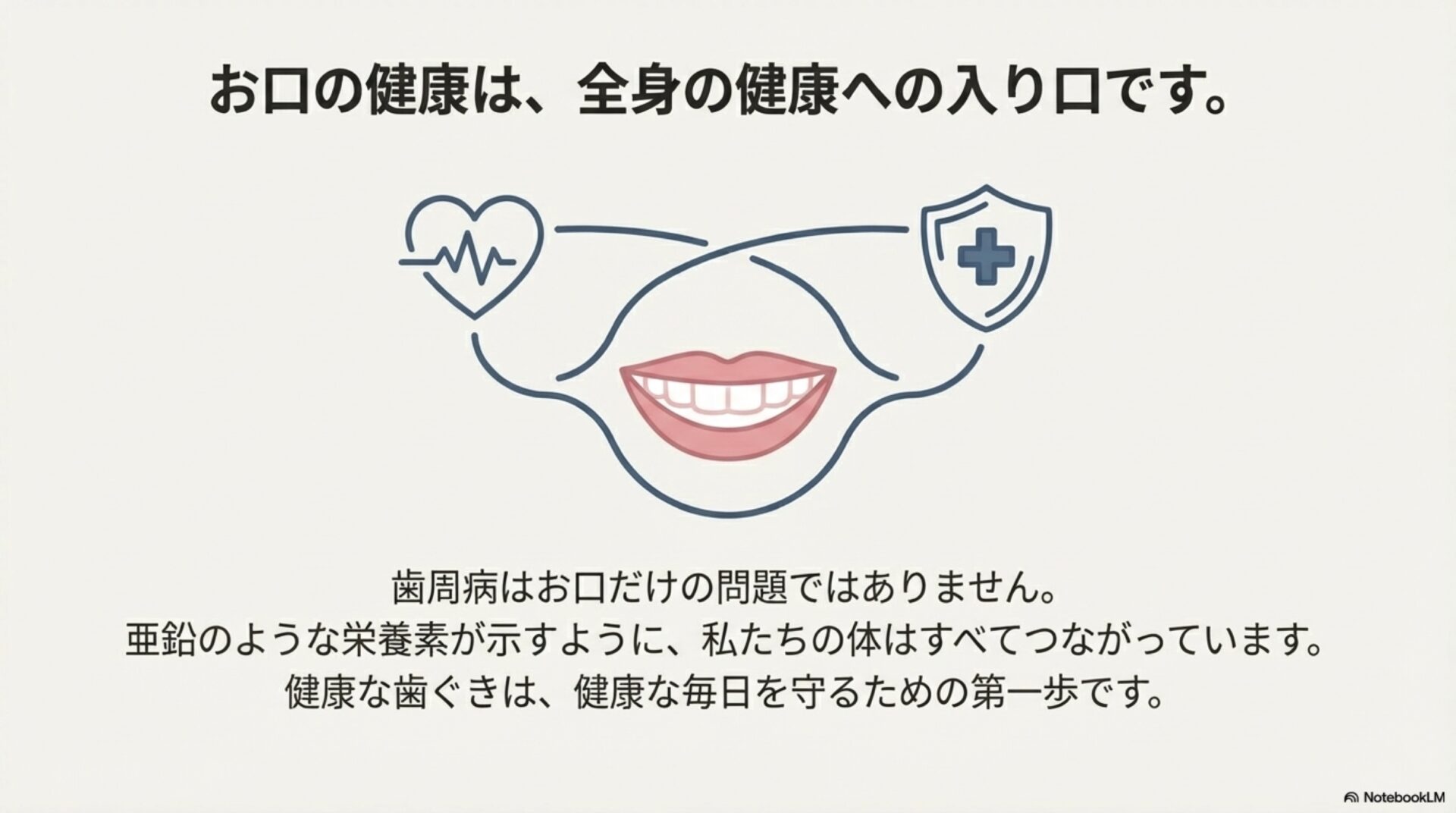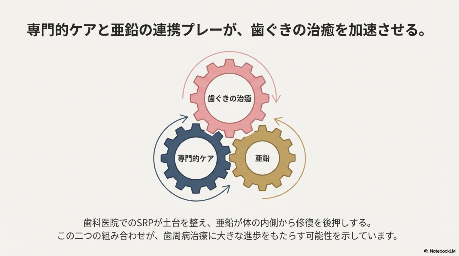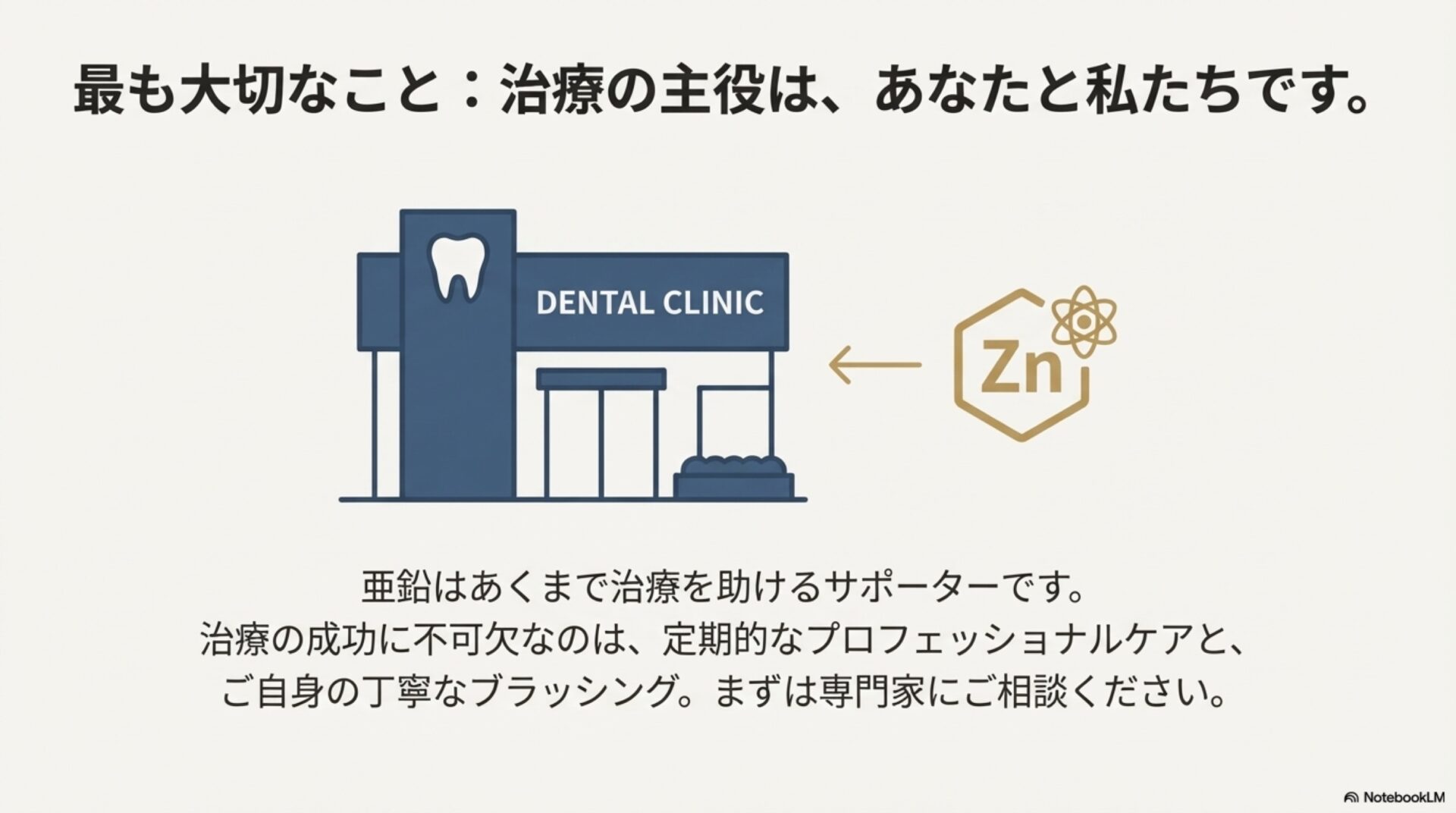 歯科専門家による治療が歯周病管理の基本であることは変わりません。しかし、今回の研究は、亜鉛の補給のような栄養面からのサポートが、治療効果を高める強力なパートナーとなり得ることを示しています。ただし、サプリメントの摂取を始める前には、必ずかかりつけの歯科医師や医師に相談することが重要です。