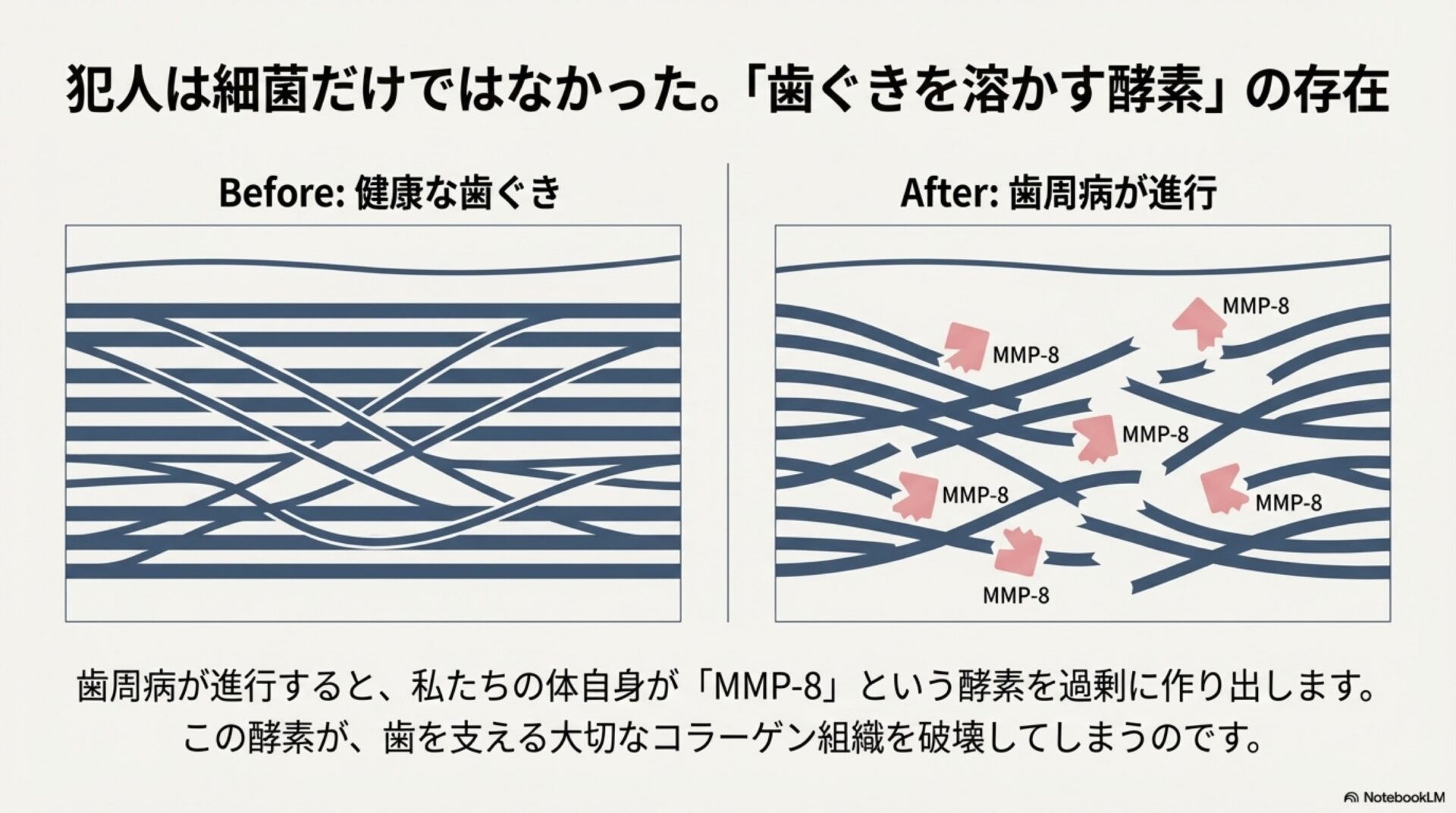 - 歯周病になると、「マトリックスメタロプロテイナーゼ-8(MMP-8)」と呼ばれる酵素が過剰に活動し始めます。この酵素は、歯を骨に固定している「ケーブル」の役割を持つコラーゲン(I型およびIII型)を分解する特異な能力を持っており、歯を支える歯ぐきや骨などの組織の破壊を進行させる主犯格の一つです。
