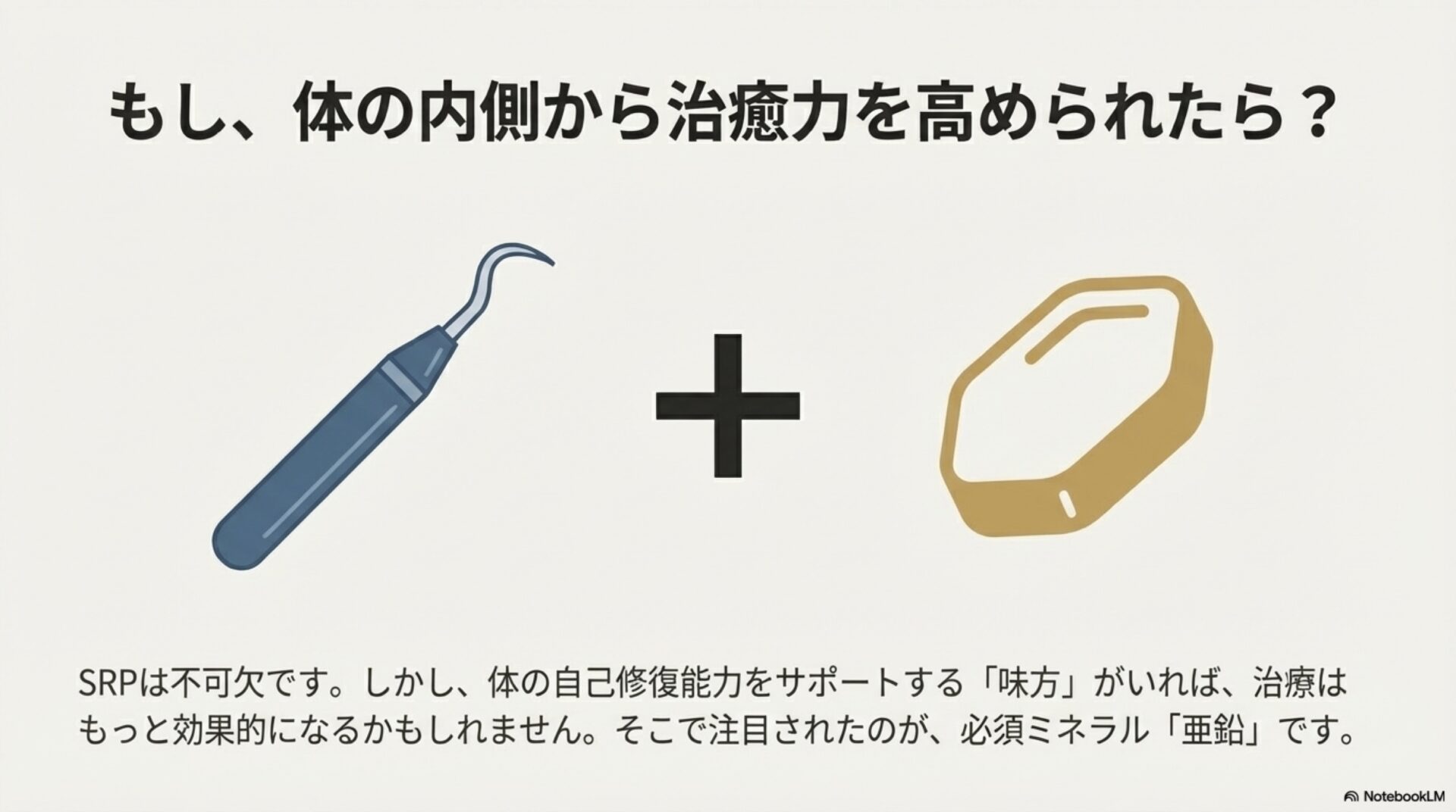 歯周病の治療と聞いて、多くの方が歯科医院でのスケーリング・ルートプレーニング(歯石除去や歯根面の滑沢化)を思い浮かべるでしょう。これらは確かに歯周病治療の基盤となる重要な処置です。しかし、もし、ありふれた必須微量栄養素を一つ加えるだけで、この専門的な治療の効果を大きく高めることができるとしたらどうでしょうか?最近の科学的研究が、その可能性を示唆しています。