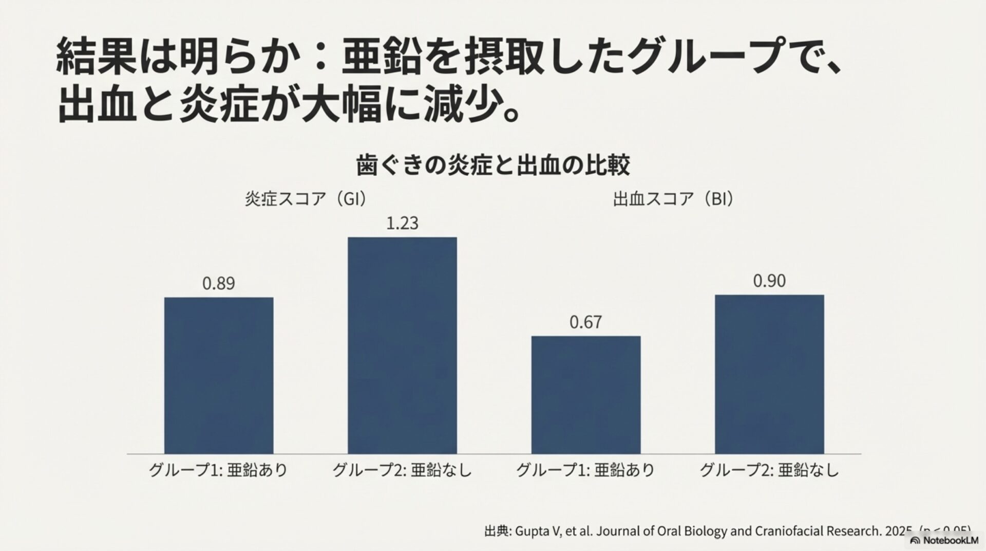 - 歯ぐきの炎症 (Gingival Index, GI): 亜鉛を摂取したグループで「非常に有意な」改善が見られました。