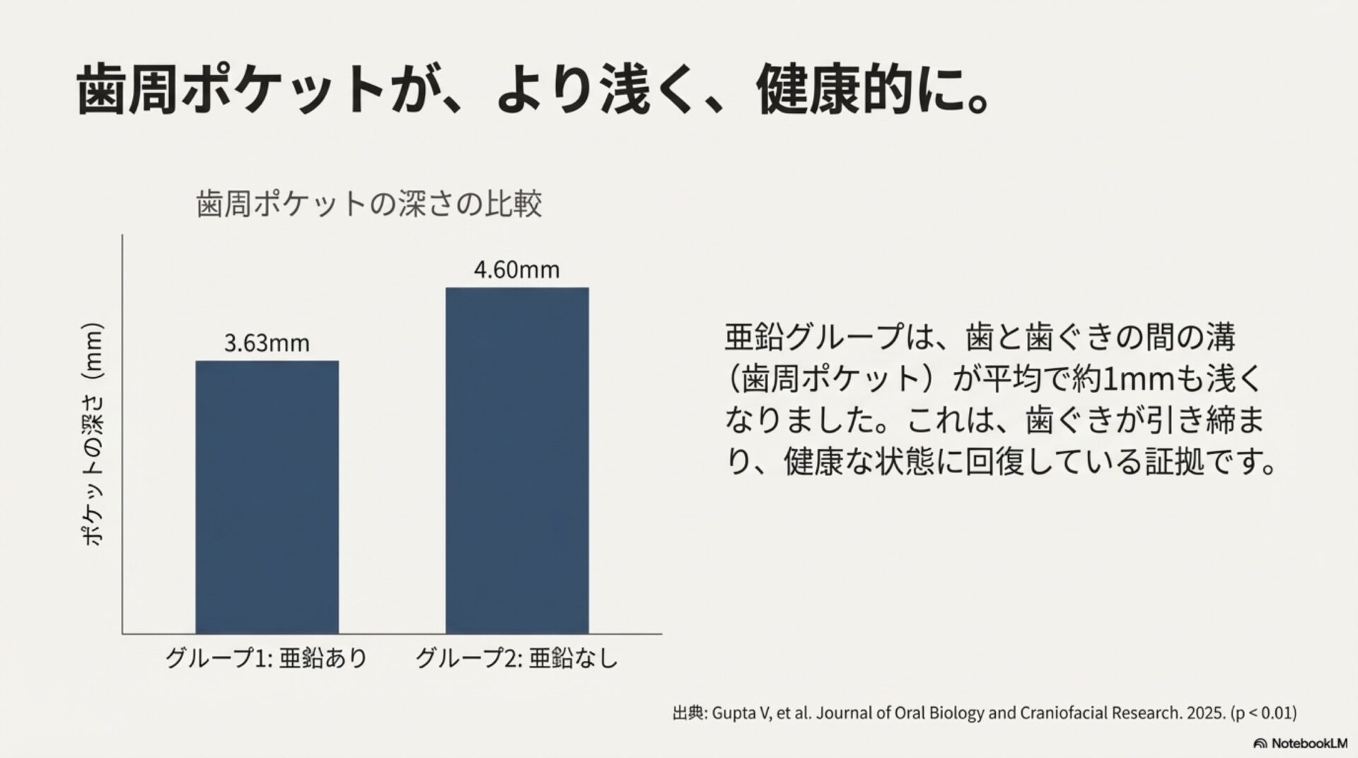 - 歯周ポケットの深さ (Probing Pocket Depth, PPD): 亜鉛グループで「非常に有意な」減少が見られました。