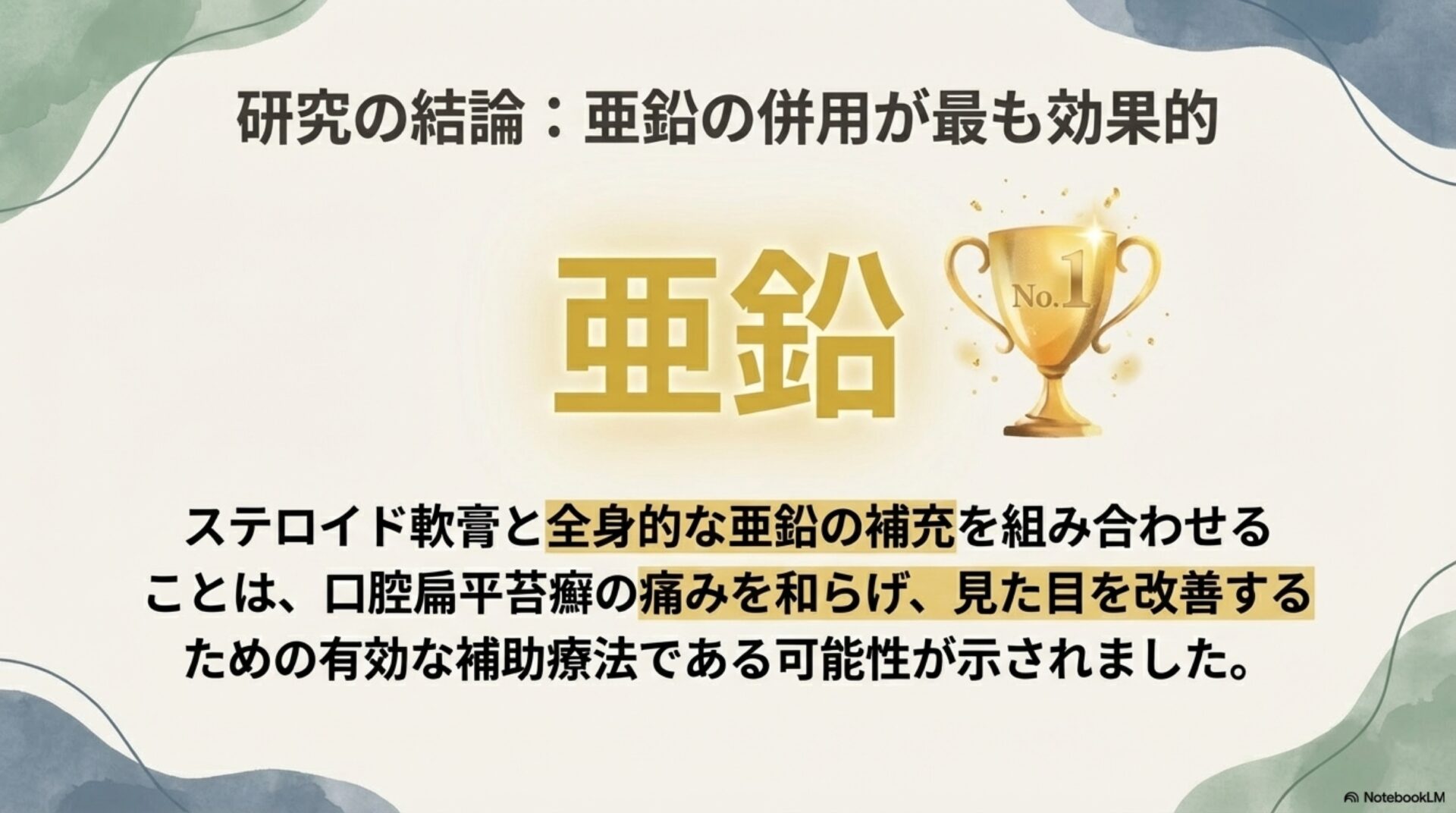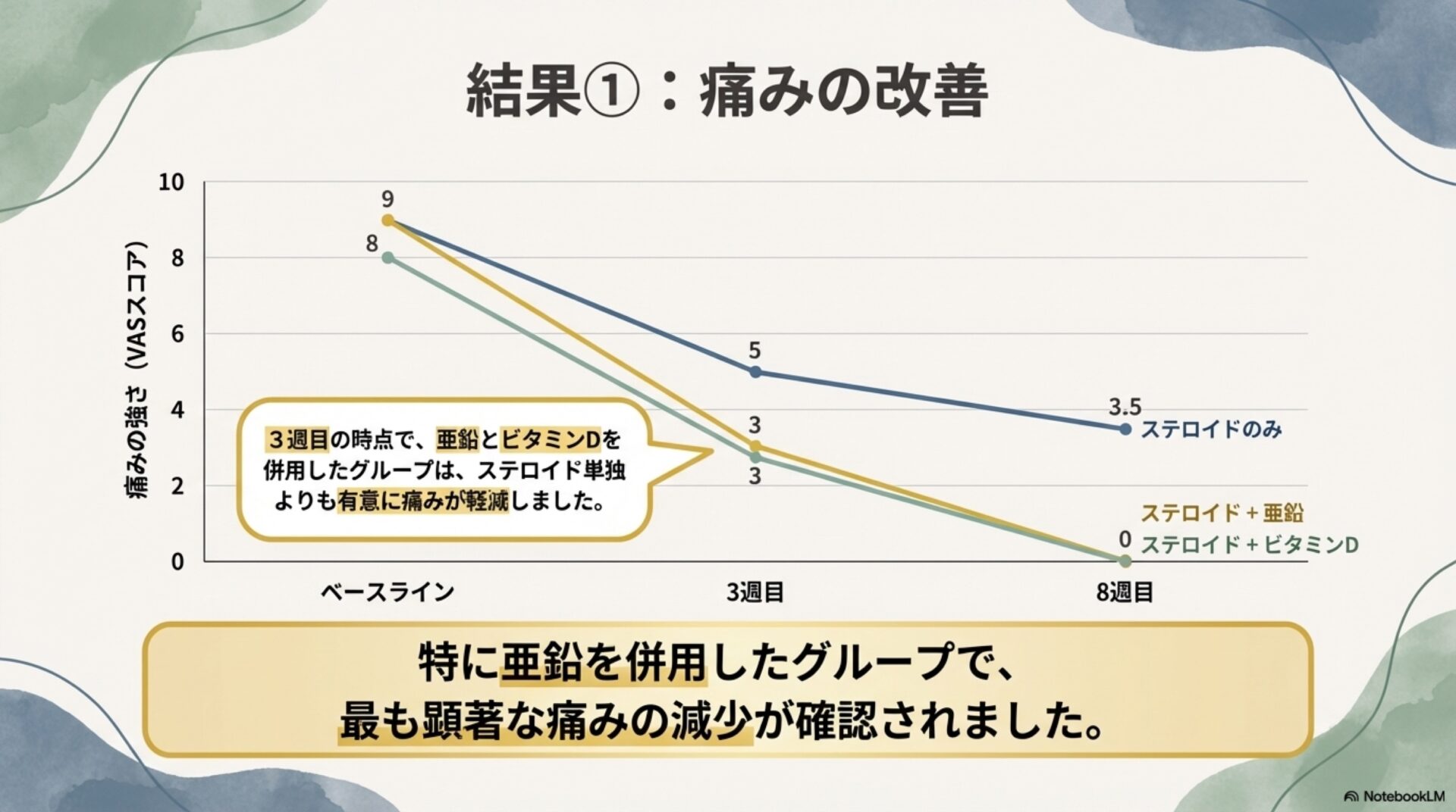 • 痛みの軽減: 治療開始からわずか3週目で、亜鉛を併用したグループの痛みは、ステロイド単独のグループに比べて大幅に低下しました。