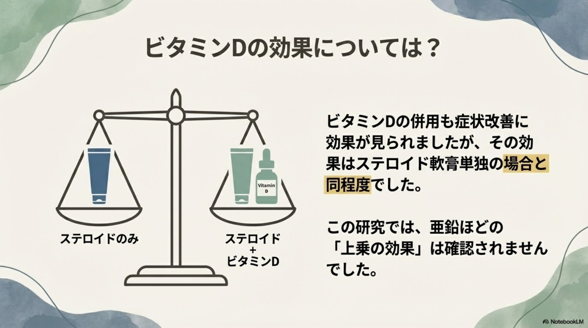 しかし、8週間後の最終的な症状の改善度や痛みの軽減効果は、残念ながら「ステロイド単独の治療と同程度」という結果でした。つまり、ビタミンDにも一定の効果はあるものの、亜鉛ほど顕著な「上乗せ効果」は確認されなかったということです。