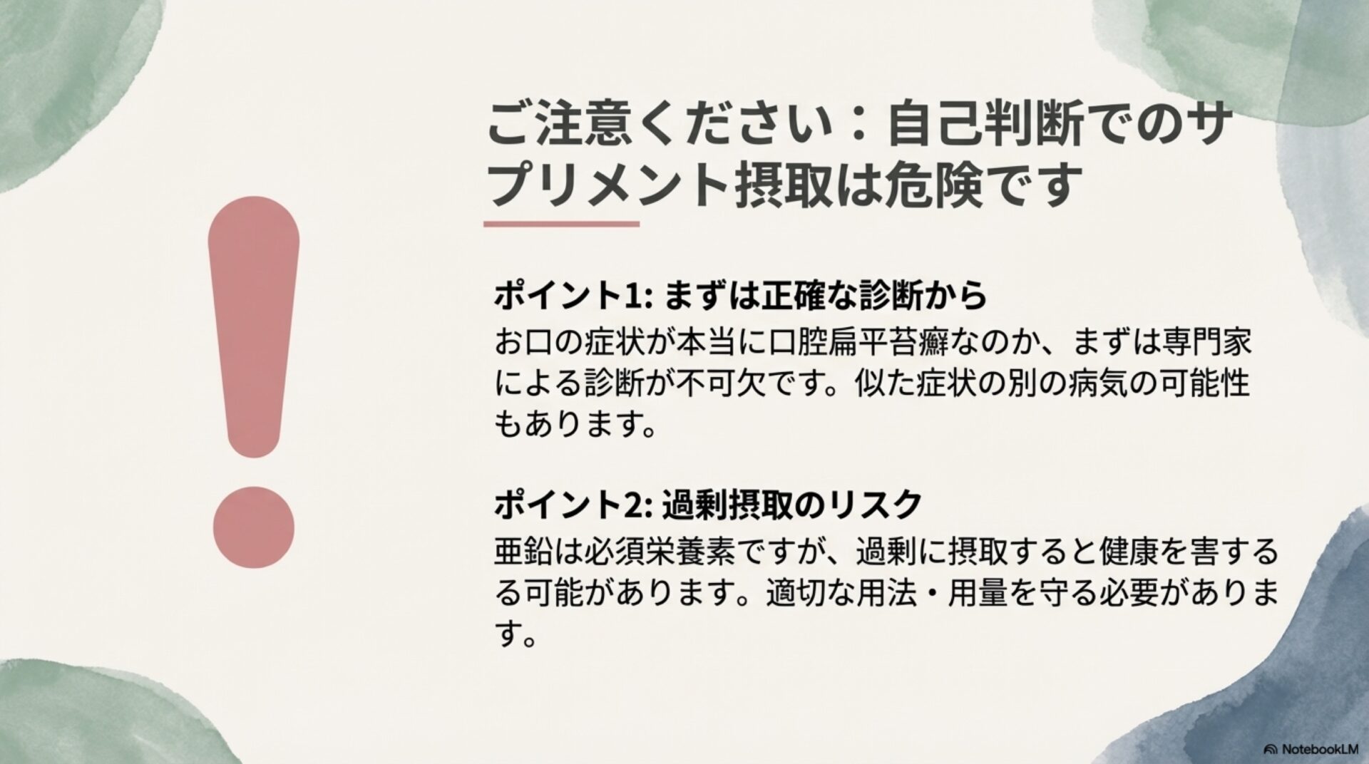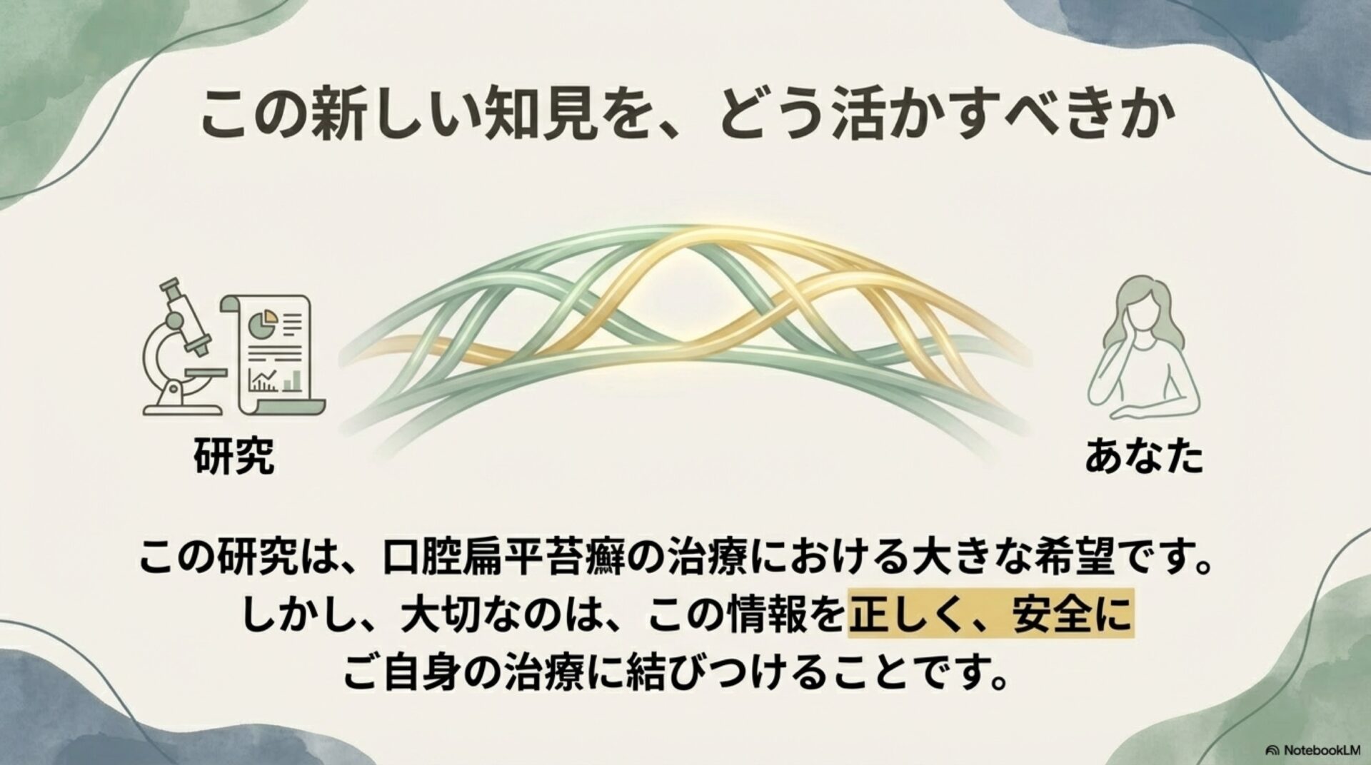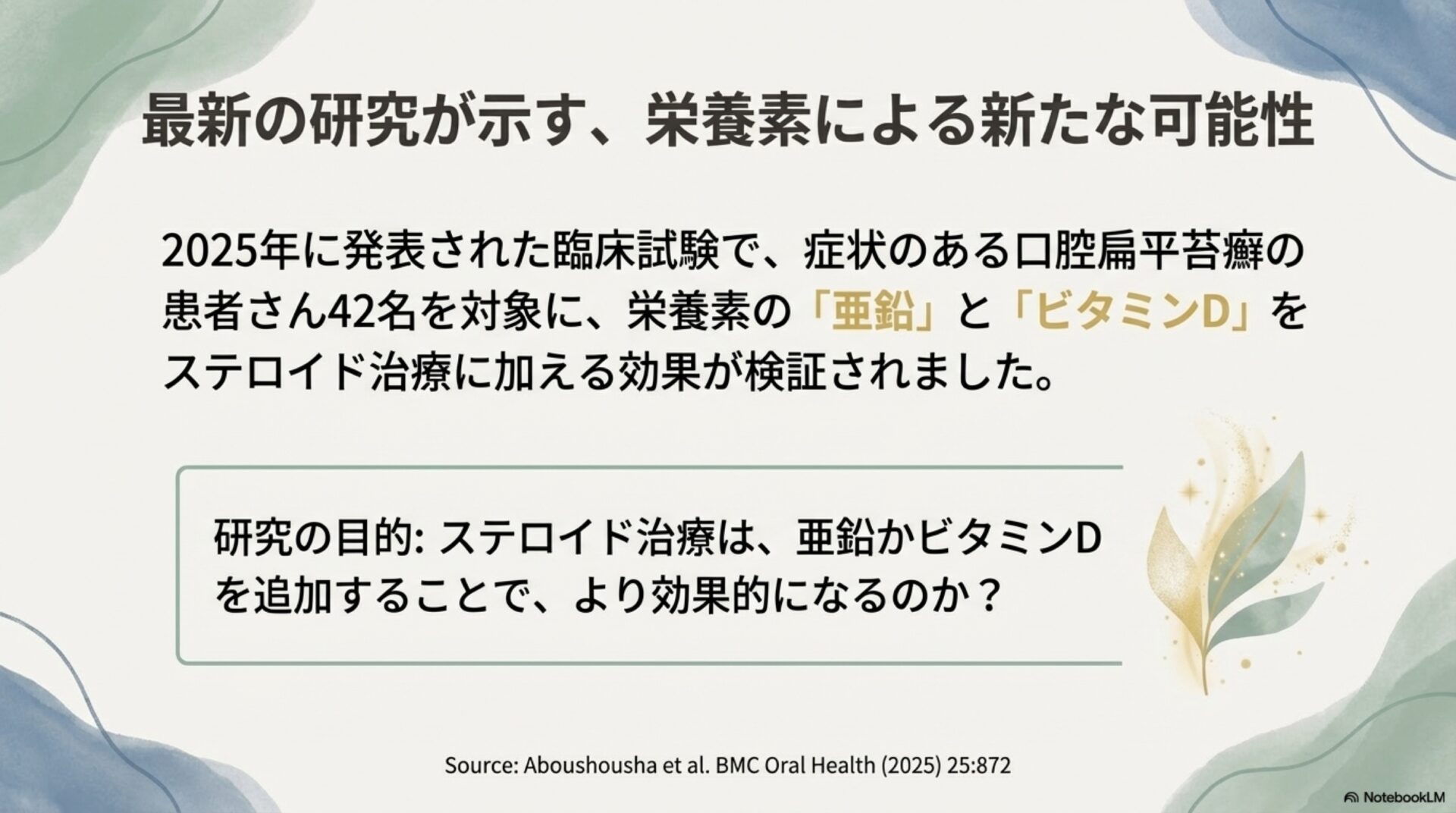 今回の記事では、最新の研究に基づき、「口腔扁平苔癬の標準治療に亜鉛を追加することで、痛みと症状がより効果的に改善される可能性がある」という重要な発見をご紹介しました。